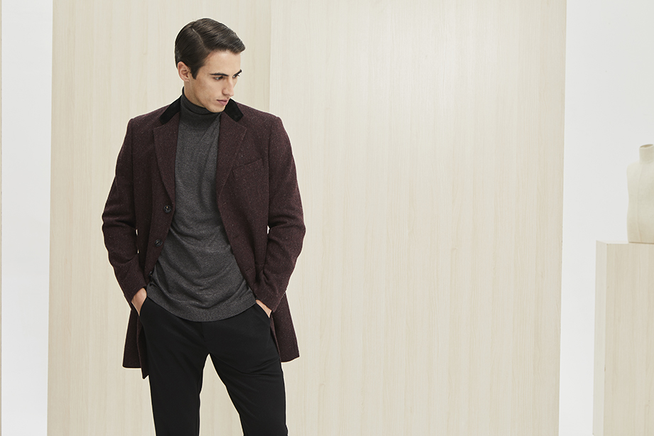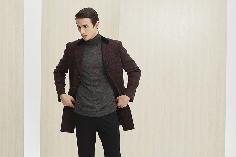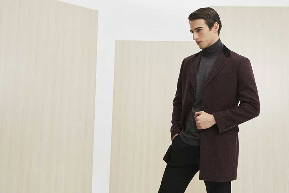 金丝绒拼接领设计,突显时尚与品质;衣襟自然贴体,前胸立体挺括。