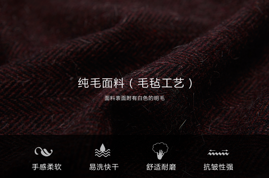 毛呢面料的特点:(1)坚牢耐磨:羊毛纤维表面有一层鳞片保护着,使织物具有较好的耐磨性能,质地坚硬韧; (2)毛呢面料质地轻,保暖性好,轻巧。表面耸立着平整的绒毛,能抵御外界冷空气的侵袭,并使人体产生的热量不易散发出来; (3)弹性、抗皱性能好:羊毛具有天然卷曲性,回弹率高,织品的弹性好,用毛织物面料缝制的服装经过熨烫定形后,不易发生褶皱,能较长时间保持昵面平整和挺括美观; (4)毛呢面料吸湿性很强,它能吸收人体的排出的湿气,故穿着时感到干爽舒适; (5)毛呢的面料耐脏:因为表面有鳞片能够隐藏灰尘,不宜起静电。