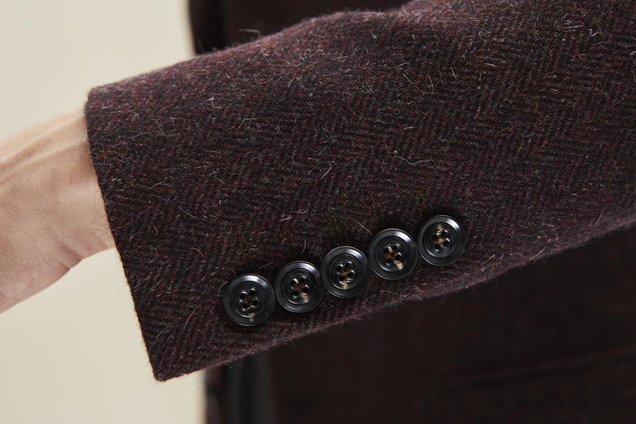 单排三粒纽扣,暗门襟,选用高品牛角扣,简约商务。