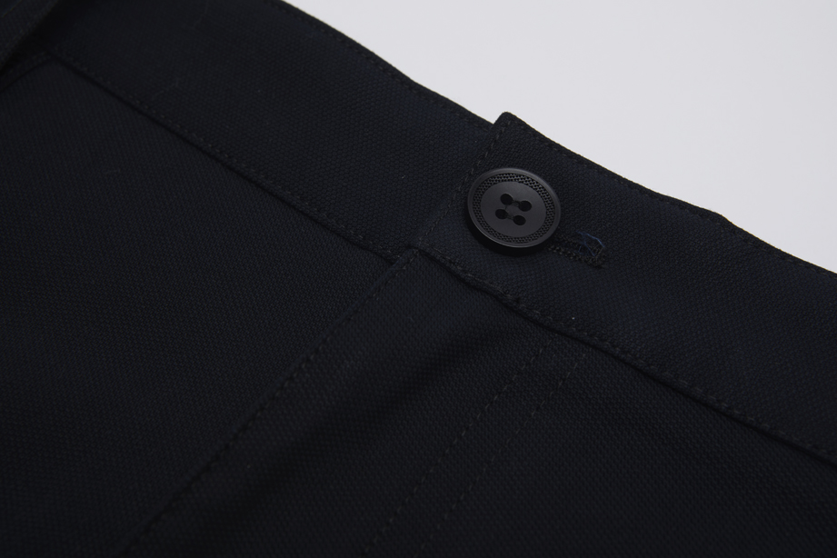 经典腰头设计,平整有型;圆润富有光泽的树脂纽扣,精致美观,十字走线防脱落。