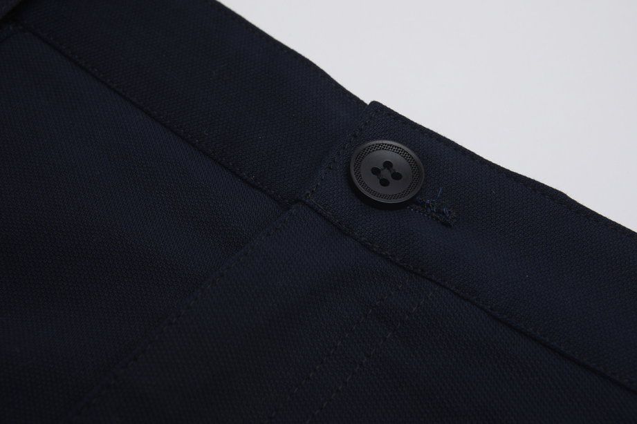 经典腰头设计,平整有型;圆润富有光泽的树脂纽扣,精致美观,十字走线防脱落。