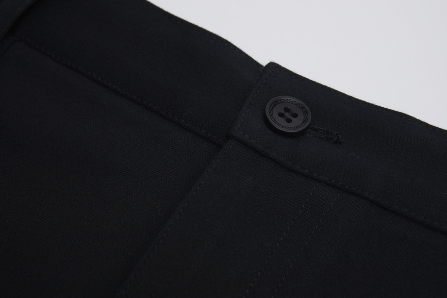 经典腰头设计,平整有型;圆润富有光泽的树脂纽扣,精致美观,十字走线防脱落。
