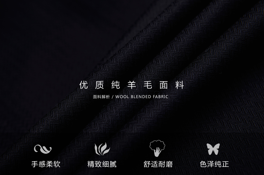 100%羊毛成分,织物手感更柔软,富有弹性,身骨挺括、不板、穿着舒适,有膘光感,颜色纯正,光泽自然柔和。精纺类表面光洁平整,质地精致细腻,纹路清晰,悬垂感较好。