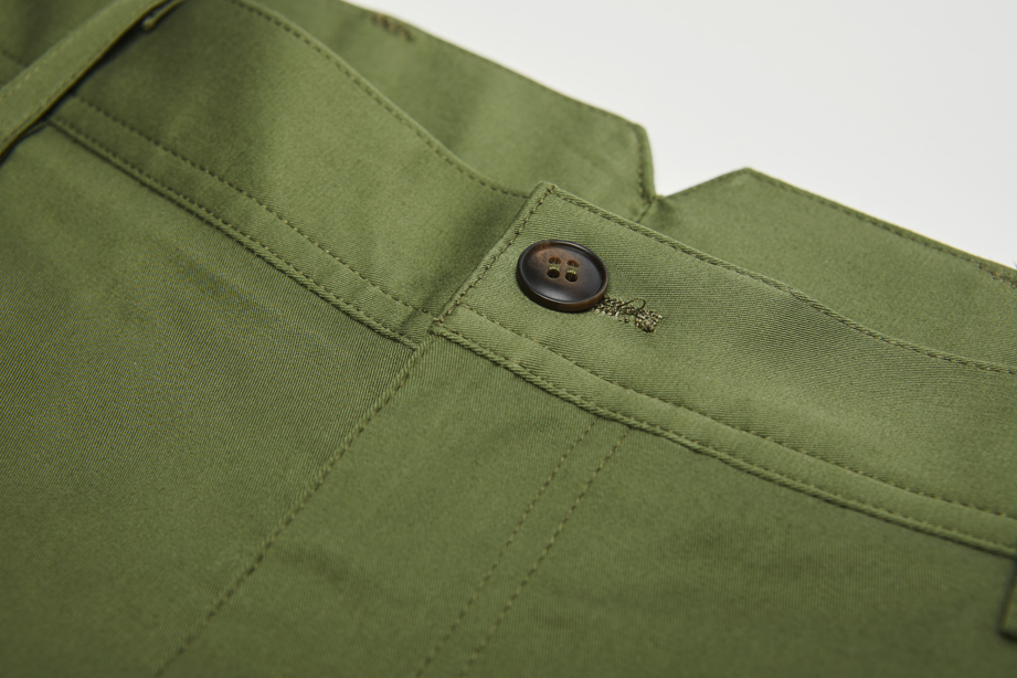 经典腰头设计,平整有型;圆润富有光泽的树脂纽扣,精致美观,十字走线防脱落。
