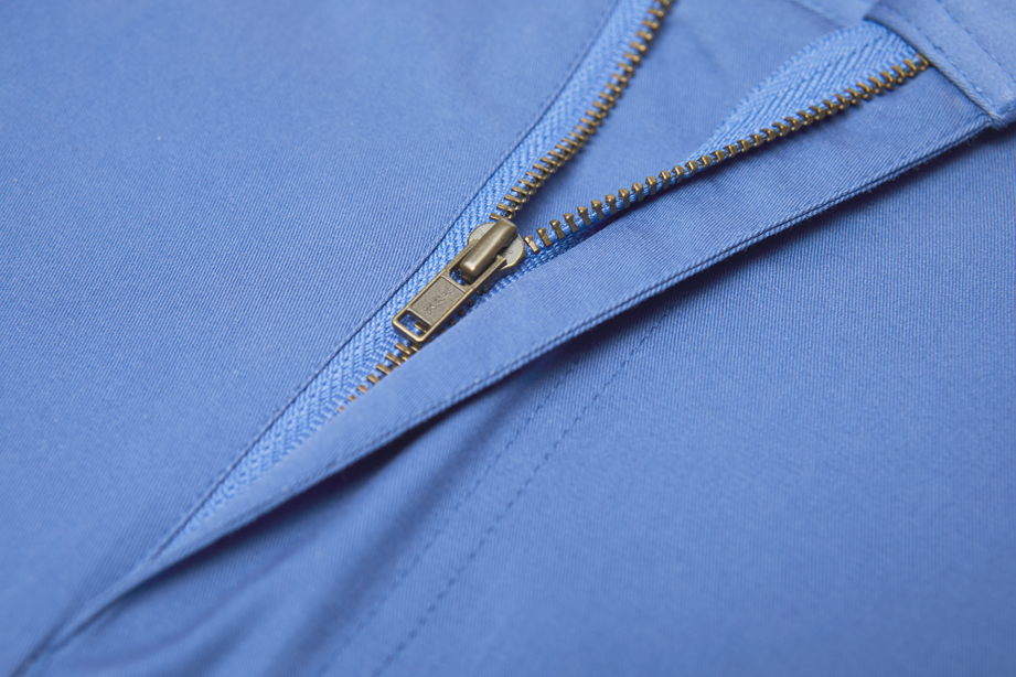 经典腰头设计,平整有型;圆润富有光泽的树脂纽扣,精致美观,十字走线防脱落。