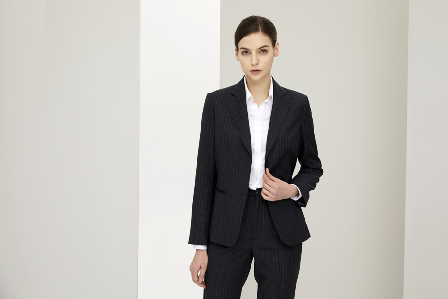 | 款名: | 深灰宽条纹羊毛混纺春秋商务戗驳头女西装 | |||||