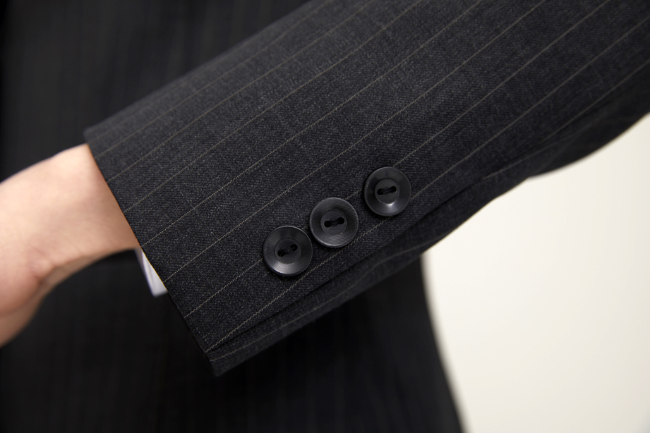 单排两粒纽扣,选用高品树脂扣。