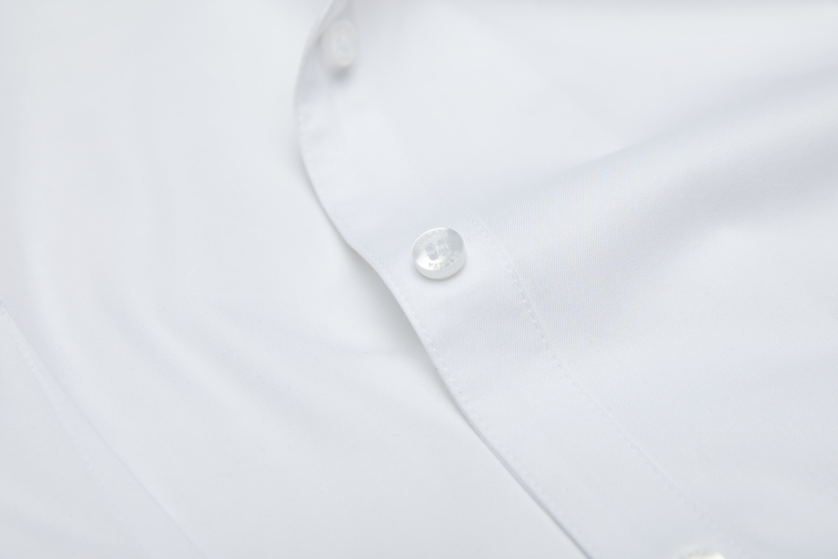 简洁的贴门襟设计;专用定制纽扣,晶莹透彻,精致耐用,车线十字走针,不易脱落。
