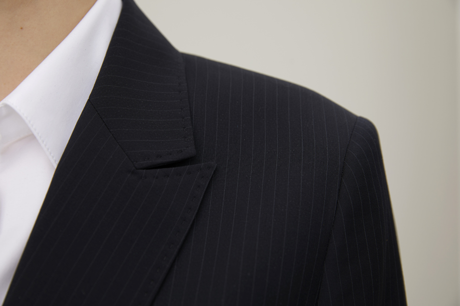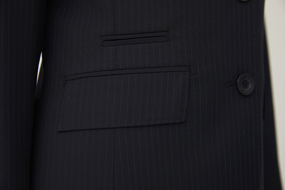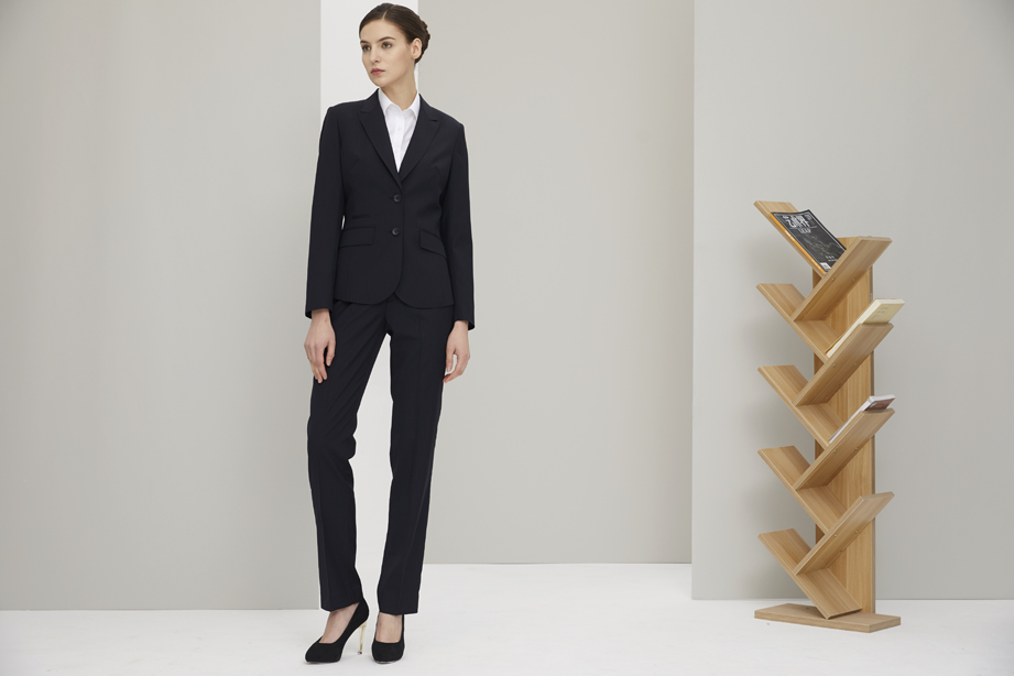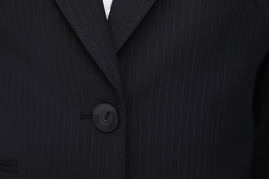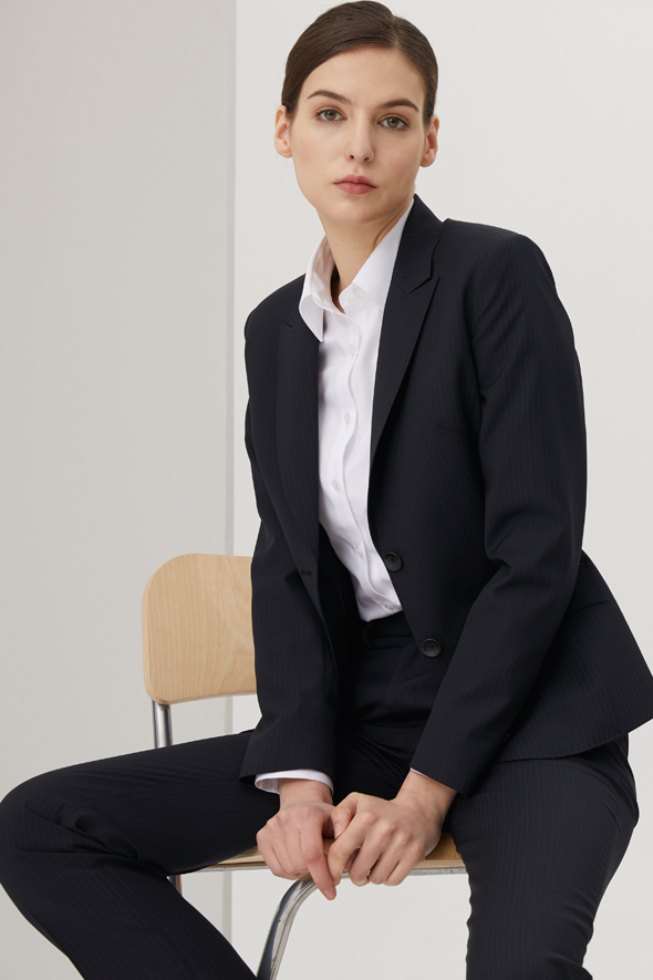 | 款名: | 蓝黑暗条纹羊毛混纺春秋二粒扣戗驳领商务女西装 | |||