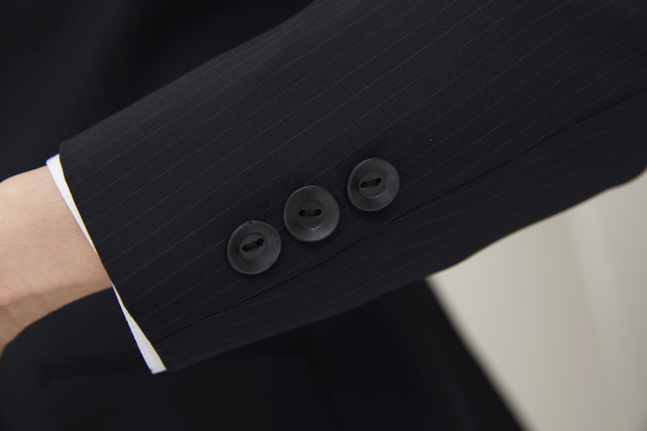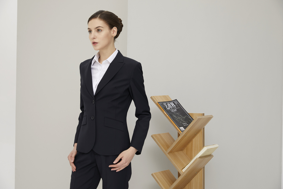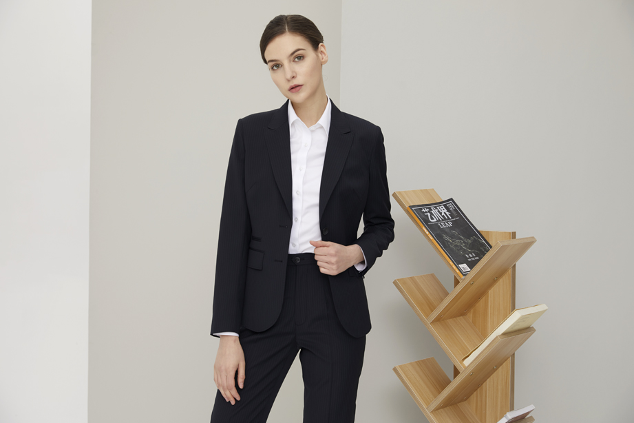 | 款名: | 蓝黑暗条纹羊毛混纺春秋二粒扣戗驳领商务女西装 | |||||