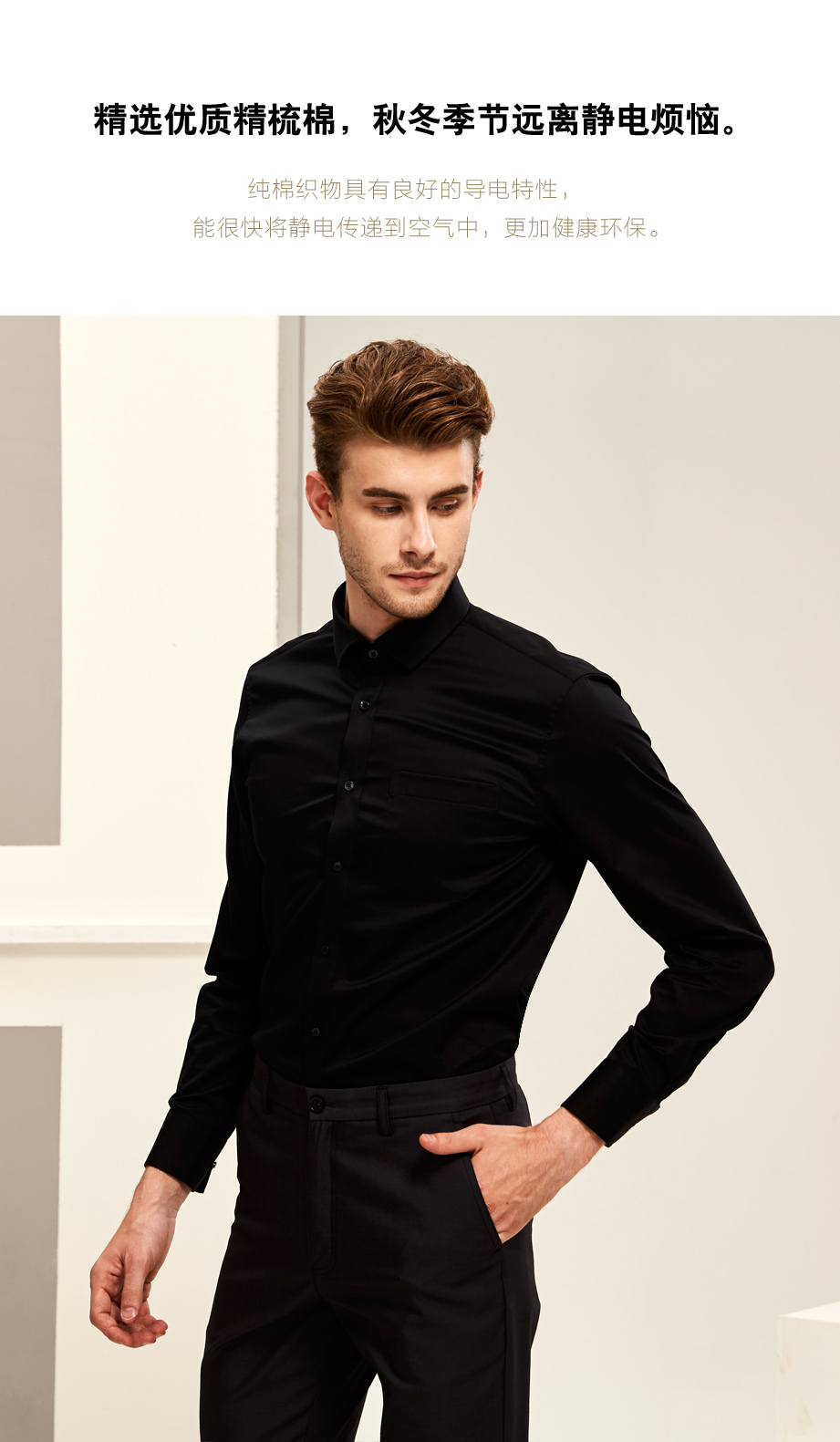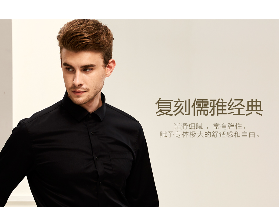 | 款名: | 黑色弹力纯棉仿丝绸小方领商务衬衫 | |||