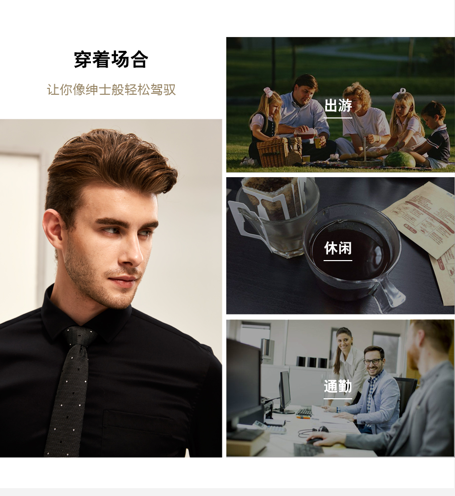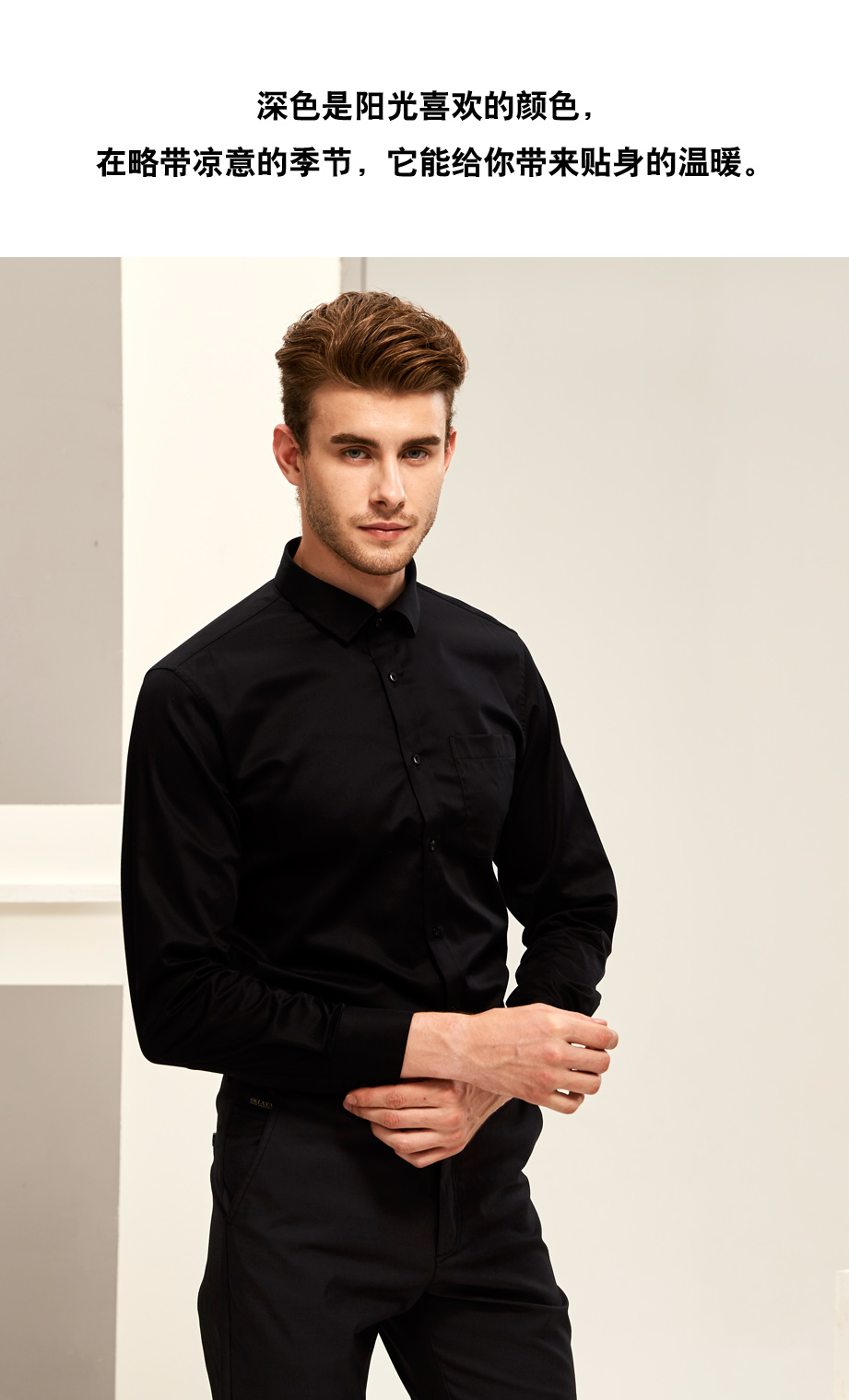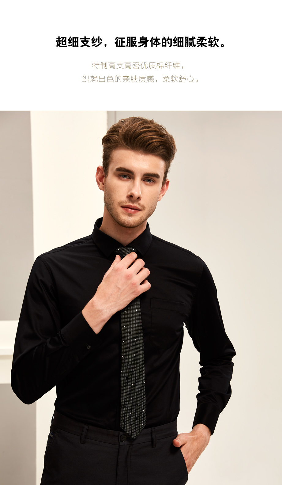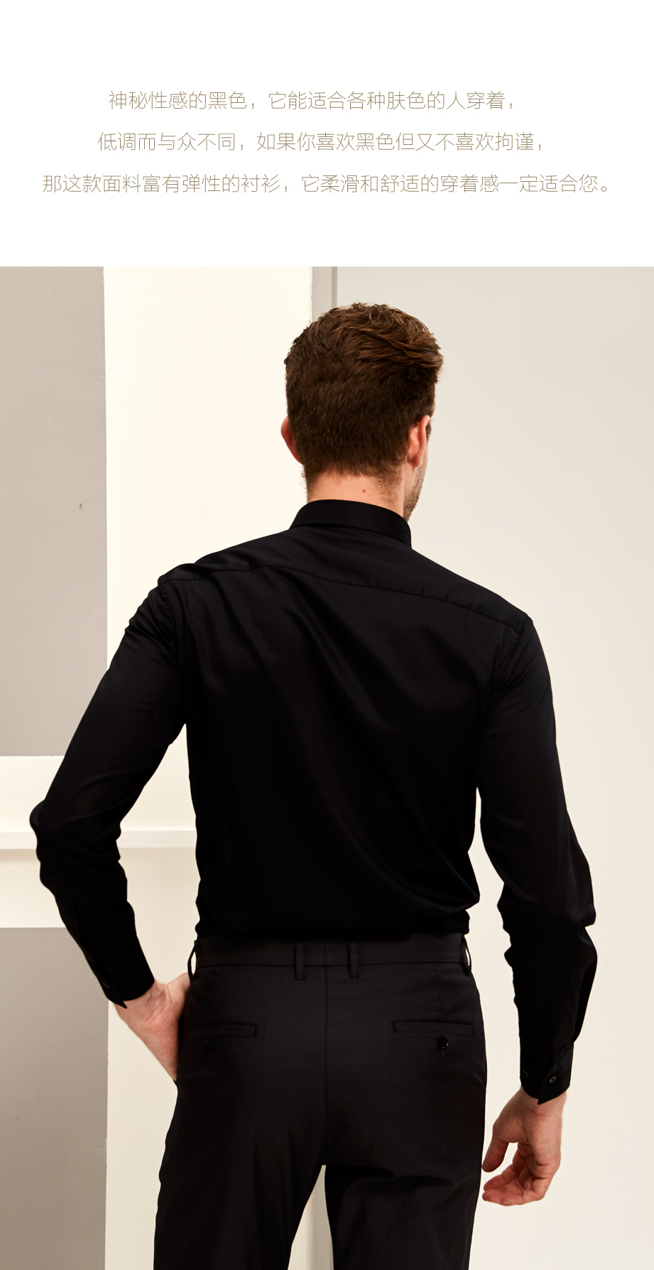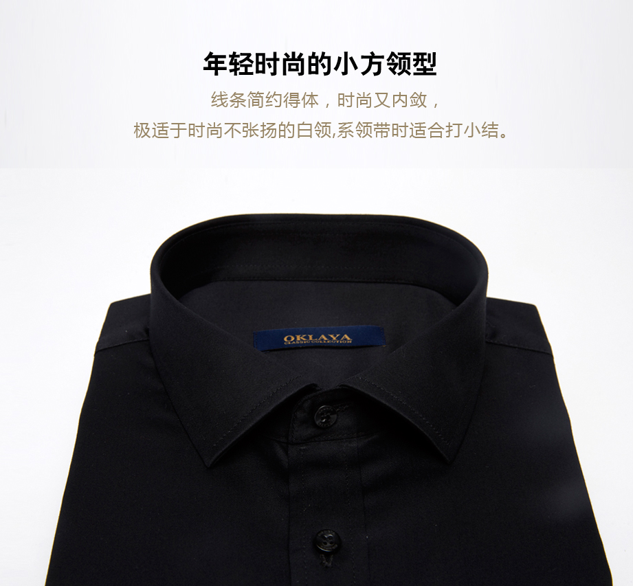 | 款名: | 黑色弹力纯棉仿丝绸小方领商务衬衫 | |||||
