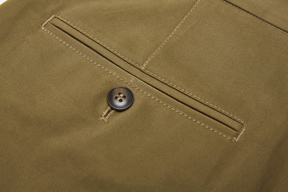 经典腰头设计,平整有型;圆润富有光泽的树脂纽扣,精致美观,十字走线防脱落。