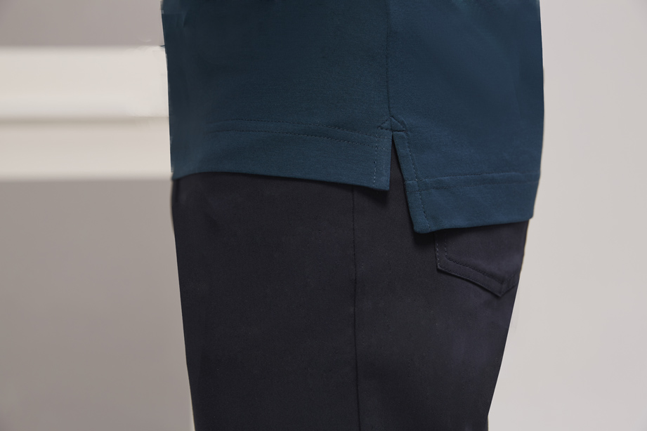 两侧下摆开衩设计,前端后长的衣身设计更符合男性身体曲线。