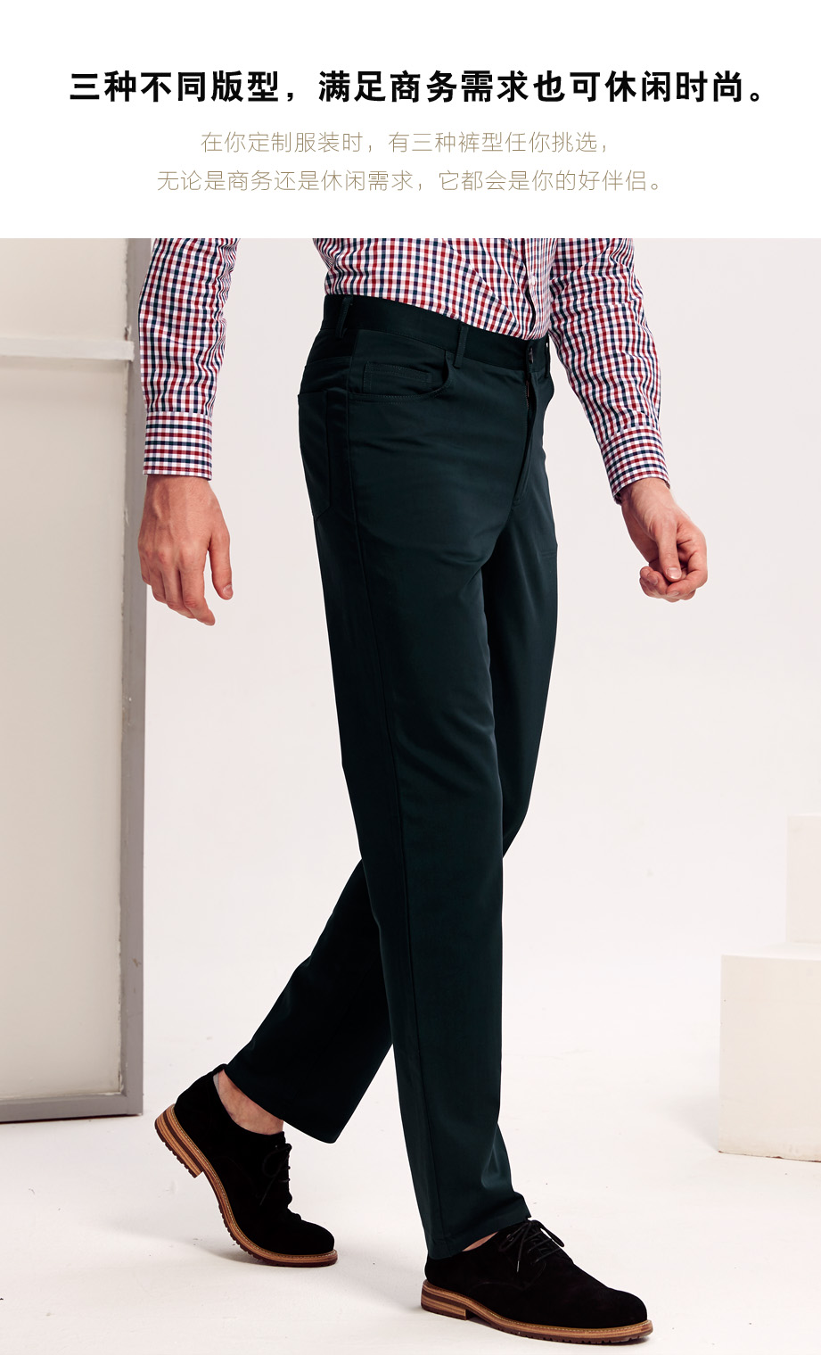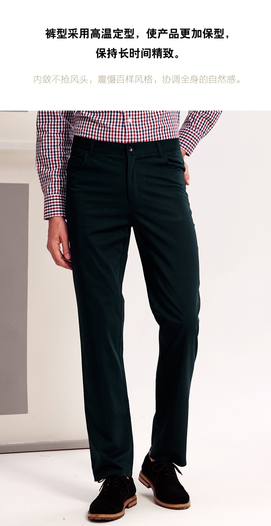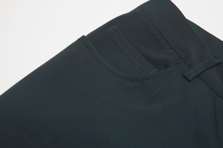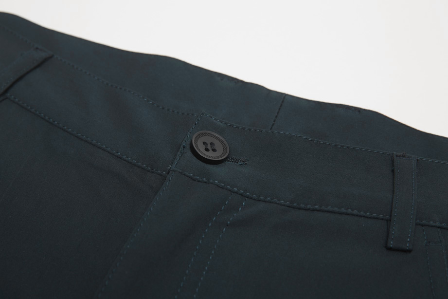 经典腰头设计,平整有型;圆润富有光泽的树脂纽扣,精致美观,十字走线防脱落。