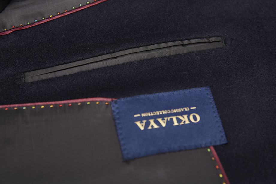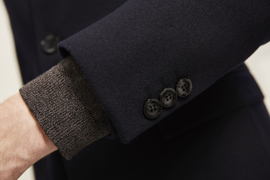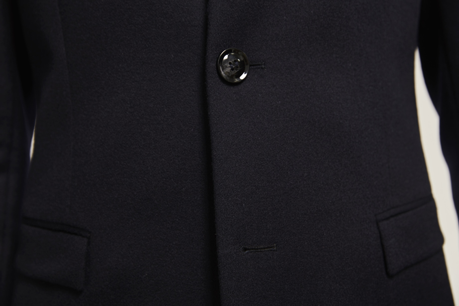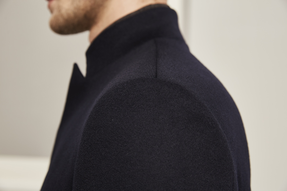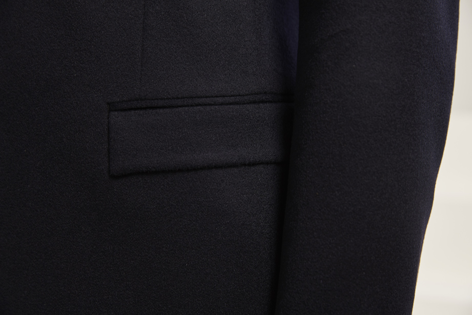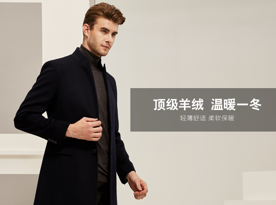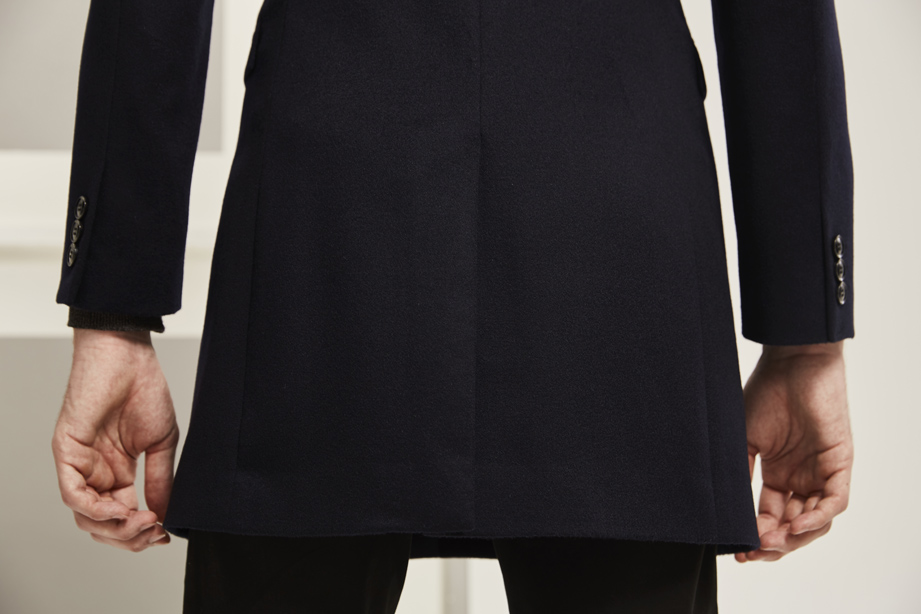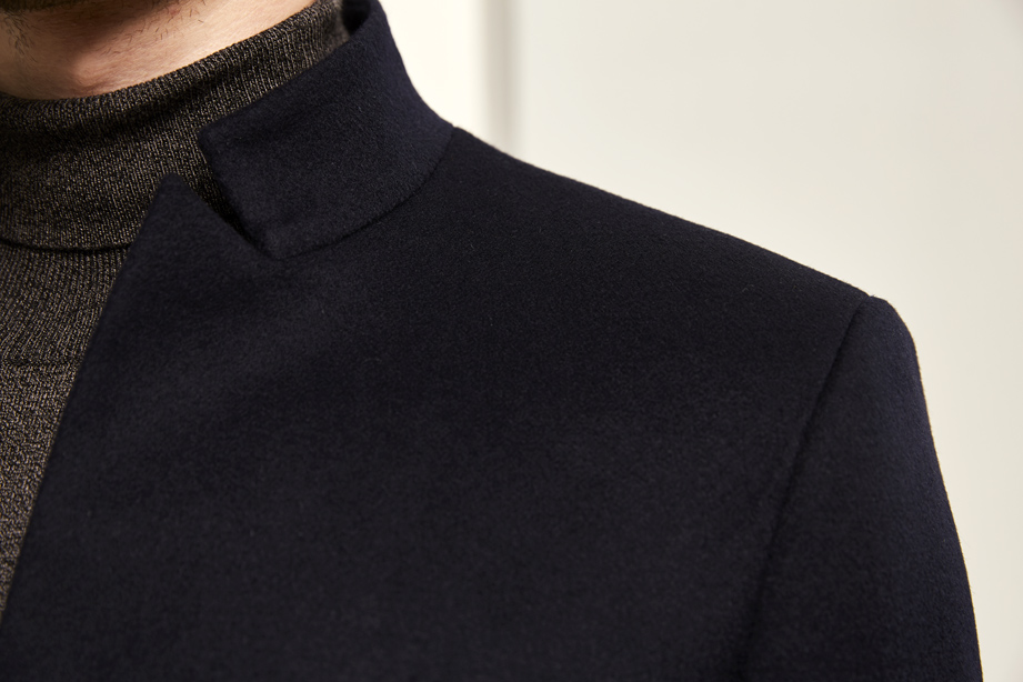 | 款名: | 深藏蓝色羊绒混纺(11.7%绒)商务立领中长款大衣 | |||