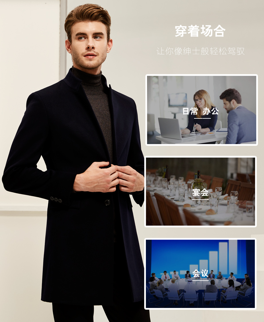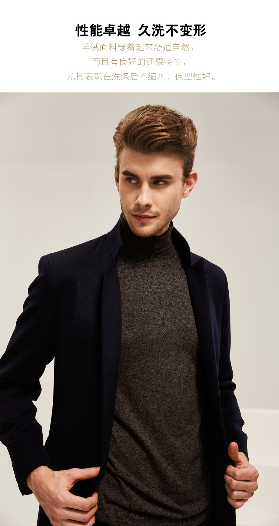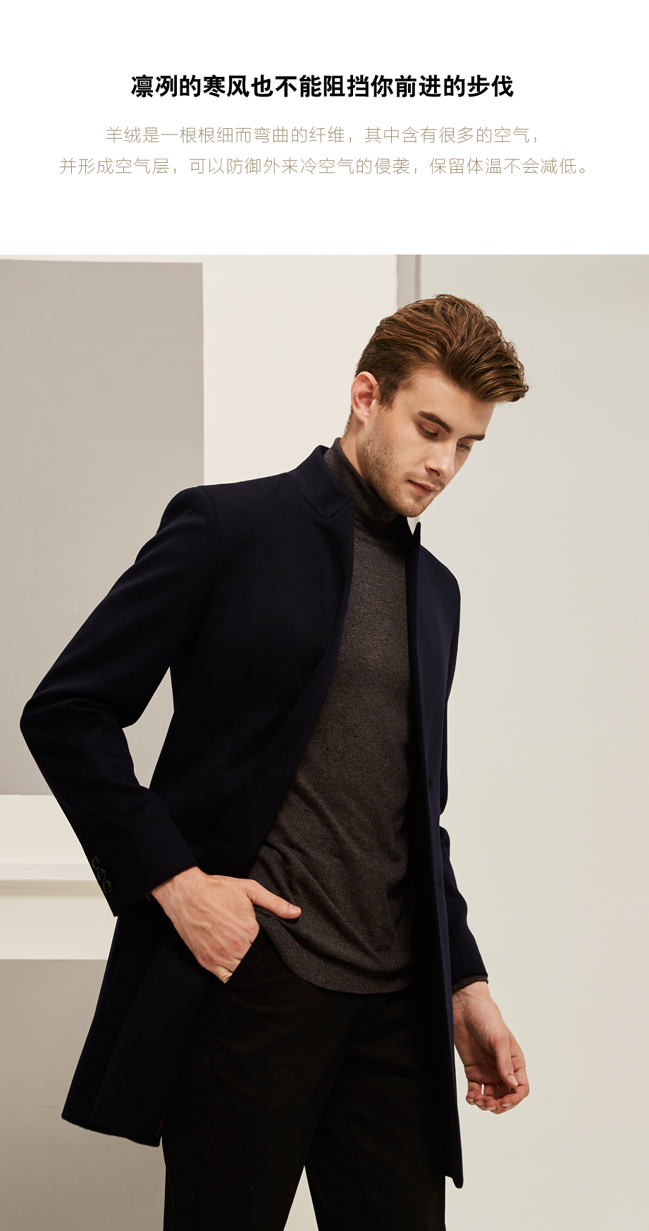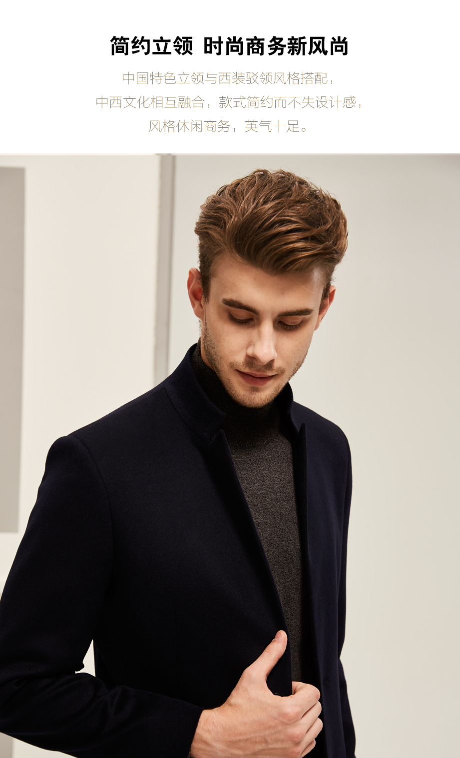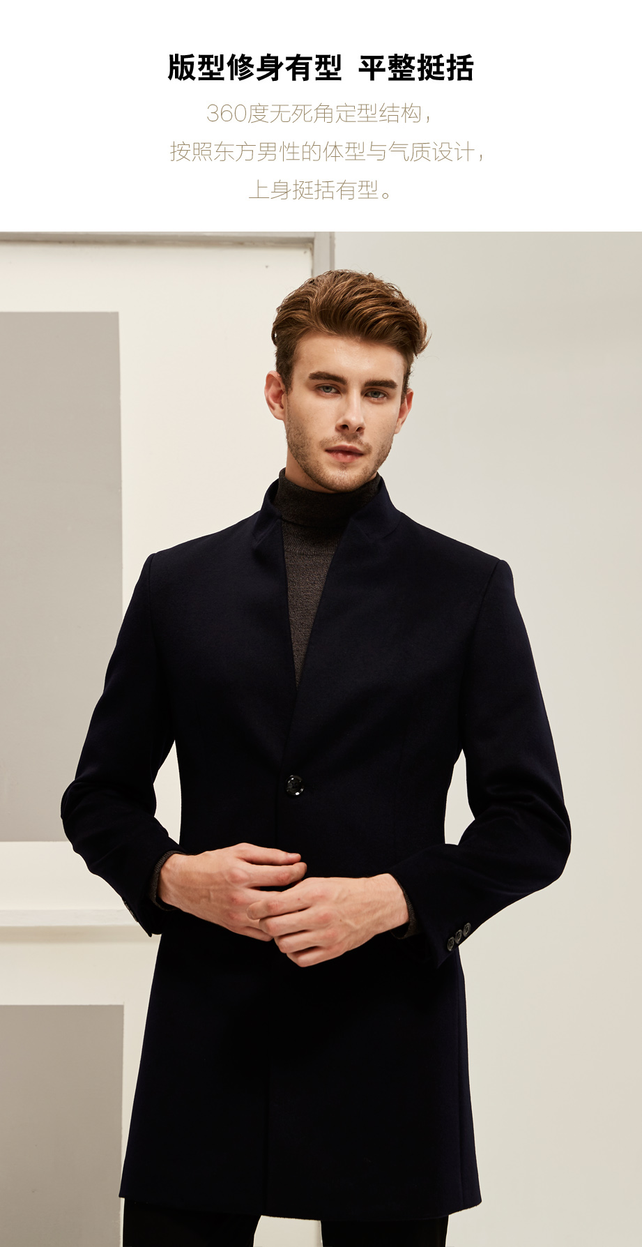 | 款名: | 深藏蓝色羊绒混纺(11.7%绒)商务立领中长款大衣 | |||||
