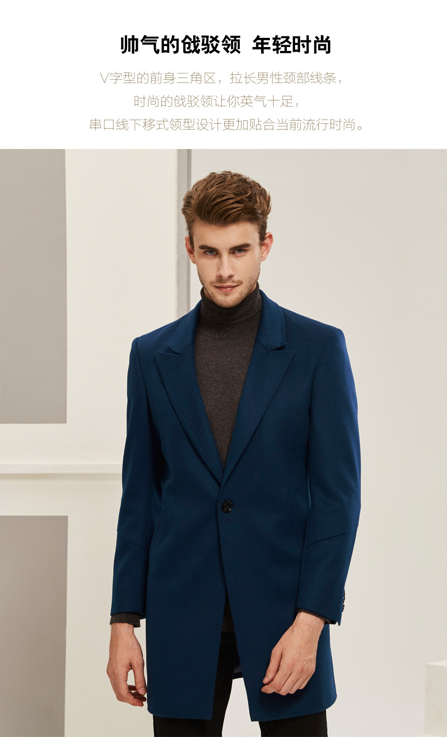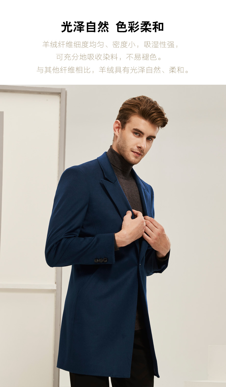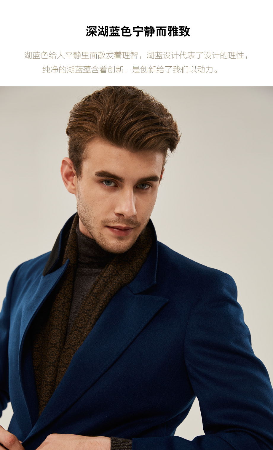 | 款名: | 深湖蓝色羊绒混纺(11.7%绒)时尚戗驳领中长款大衣 | |||
