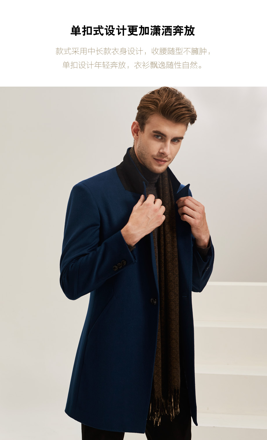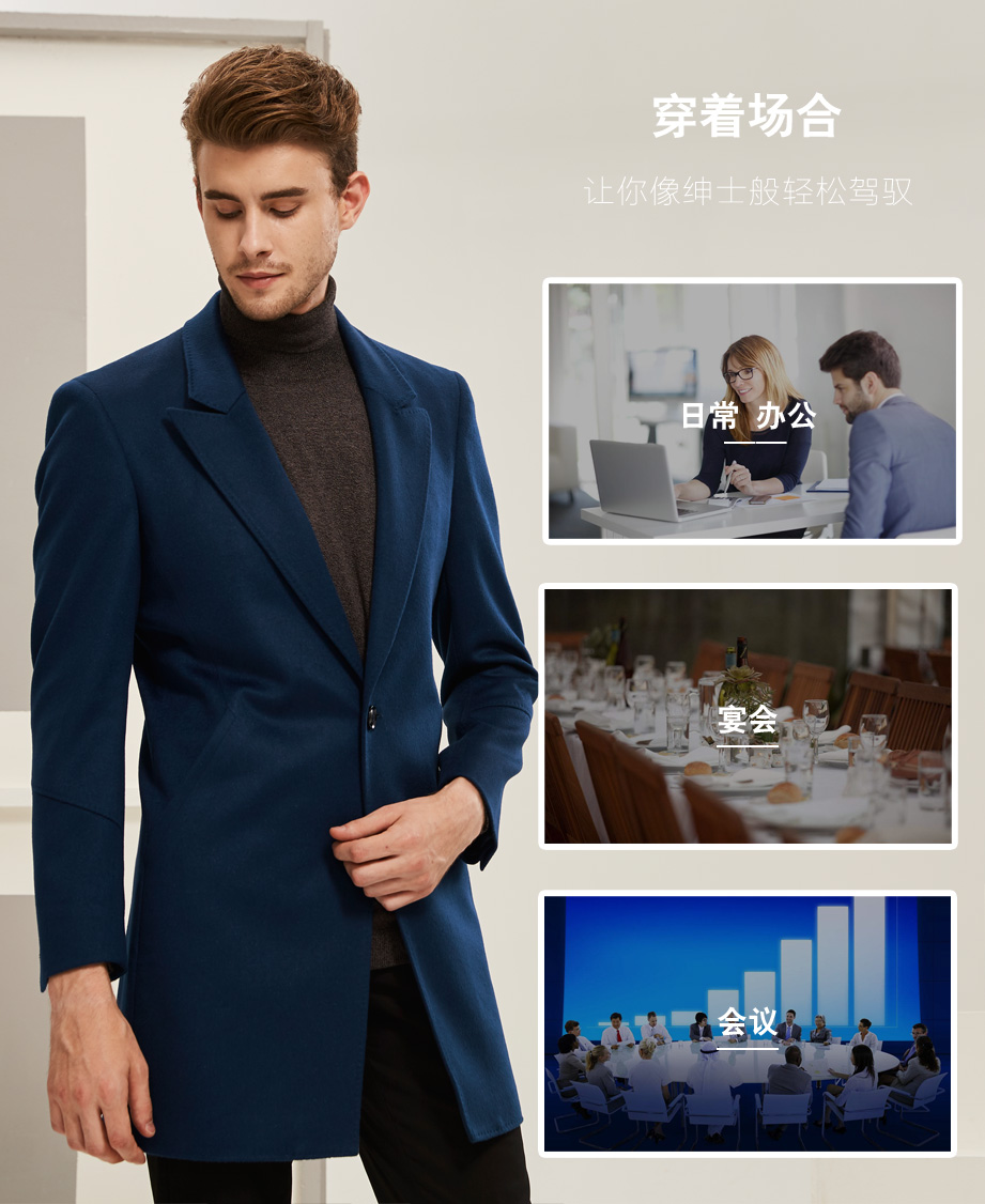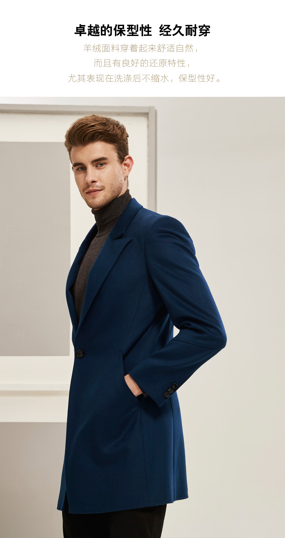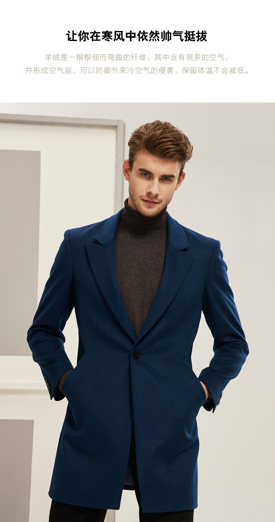 | 款名: | 深湖蓝色羊绒混纺(11.7%绒)时尚戗驳领中长款大衣 | |||