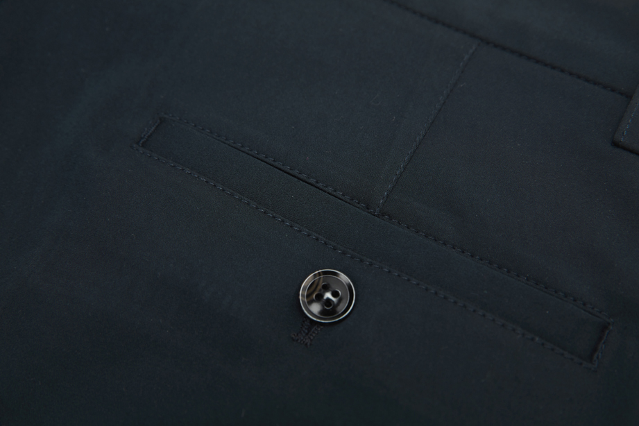 经典腰头设计,平整有型;圆润富有光泽的树脂纽扣,精致美观,十字走线防脱落。