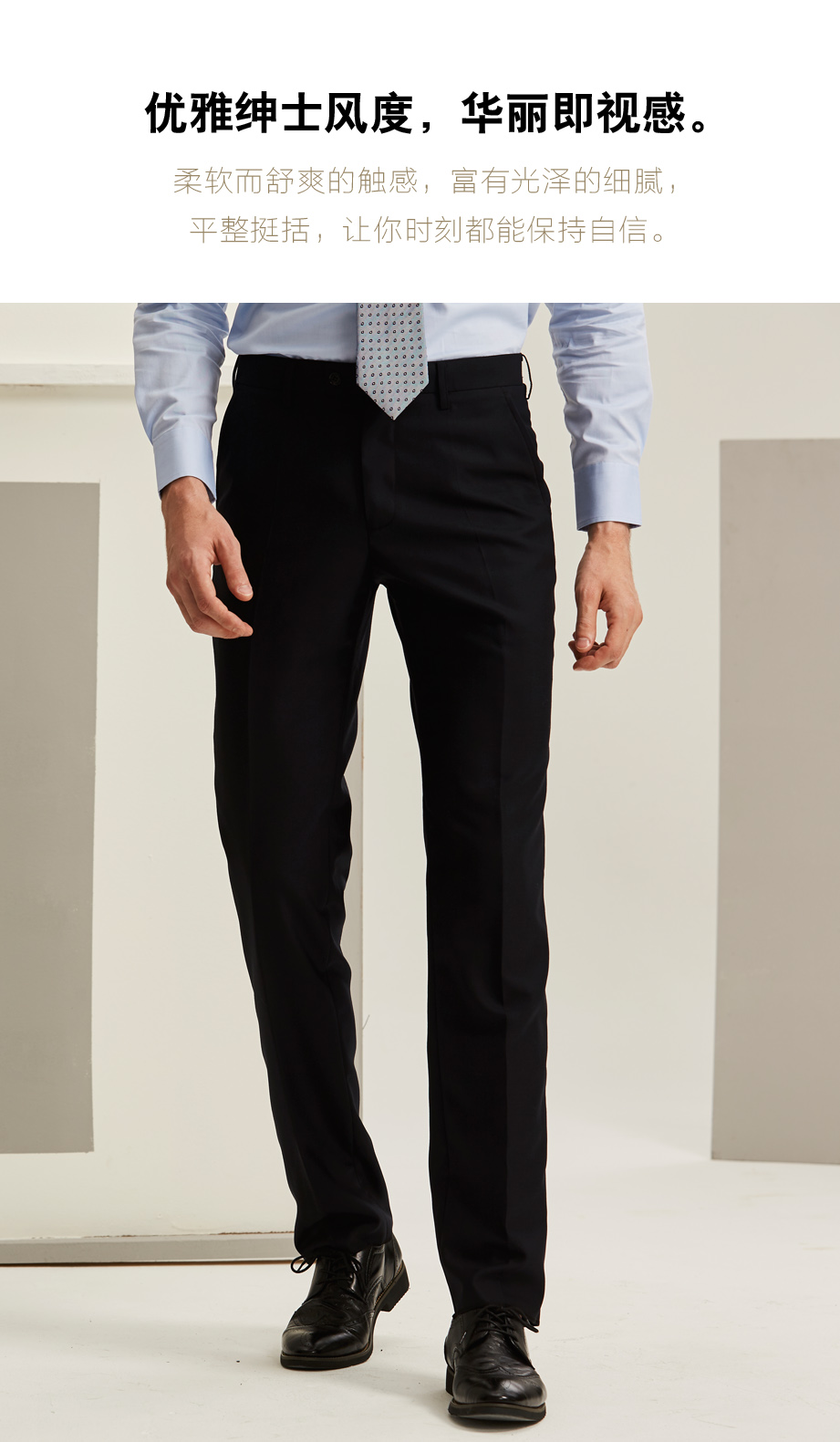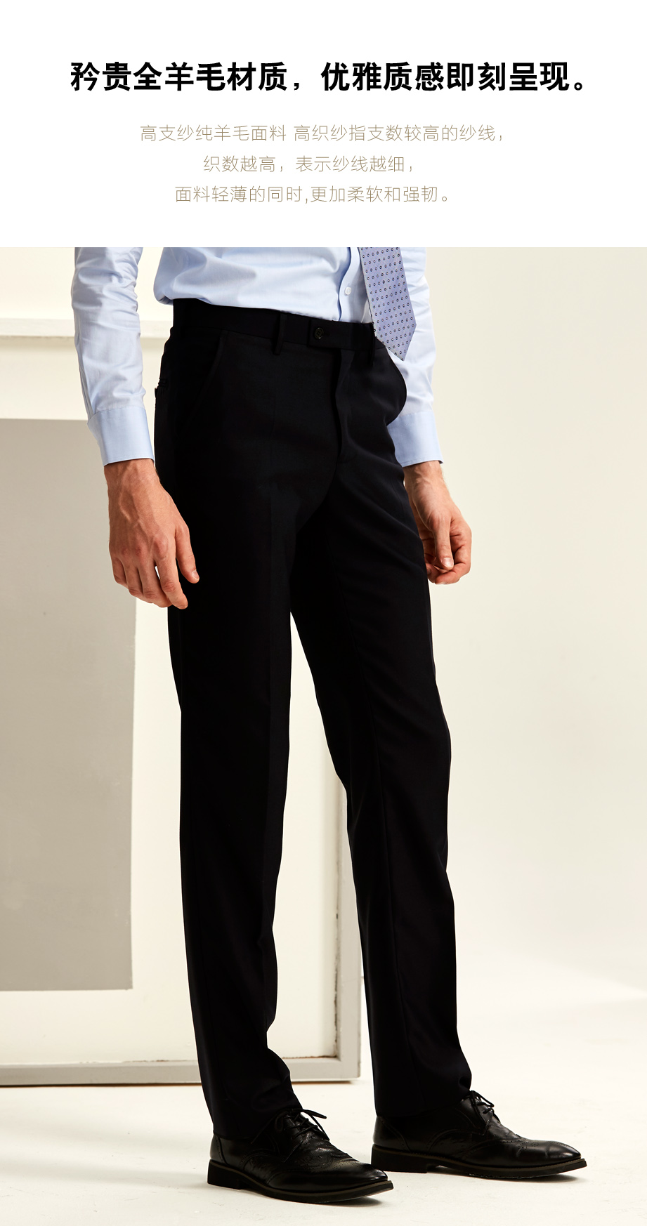| 款名: | 藏蓝色羊毛(100%毛)聚酯纤维混纺贡丝春秋款商务西裤 | |||