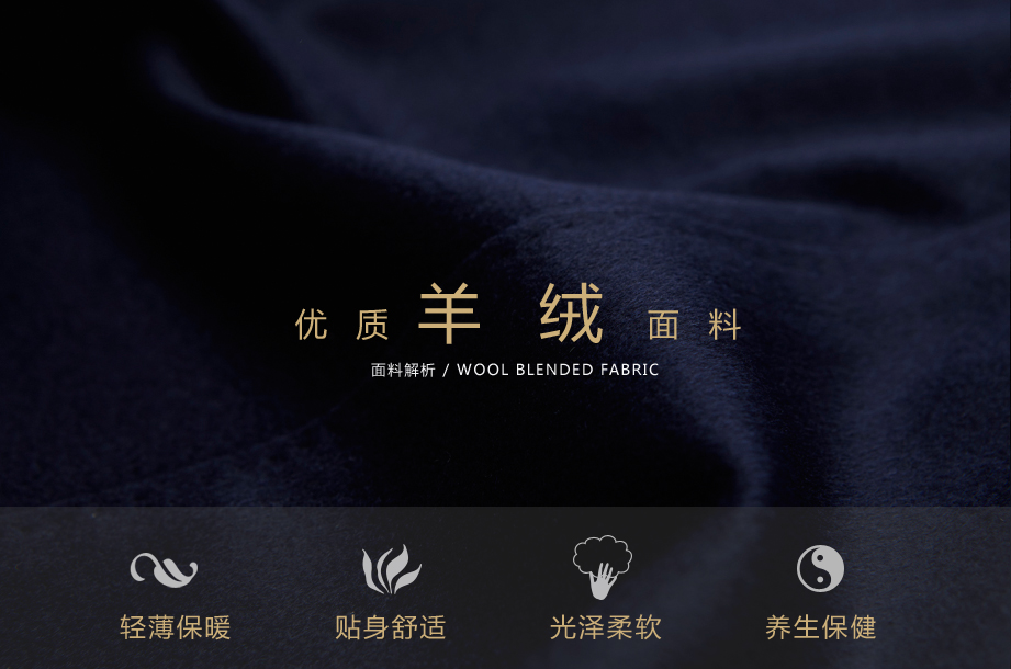 羊绒面料特点:1.珍贵如金:羊毛根部而肉皮之上的绒毛叫做羊绒,是一种非常珍贵的纺织原料,含量少,品质高,价格昂贵,在国际市场上享有“软黄金”的美称。 2.质地柔软,光泽柔和:羊绒服饰具有细腻、柔软滑糯的优良特性,那蚕丝般柔和亮丽的天然光泽,具有迷人的诱惑力。 3.轻薄保暖:一款羊绒服饰只有300克左右,羊绒纤维细度在15微米左右,因此织物纹路密而薄,并有天然卷曲、松轻而含空气,故保暖性好。 4.舒适富有弹性,羊绒服饰具有良好的吸湿性和透气性,贴身穿着,倍感舒适,具有独特的手感,浓郁的自然气息色彩。 5.保健作用:羊绒服饰贴身穿着,可以促进毛囊活动,剌激血液循环,有助于减少疲劳和保健。