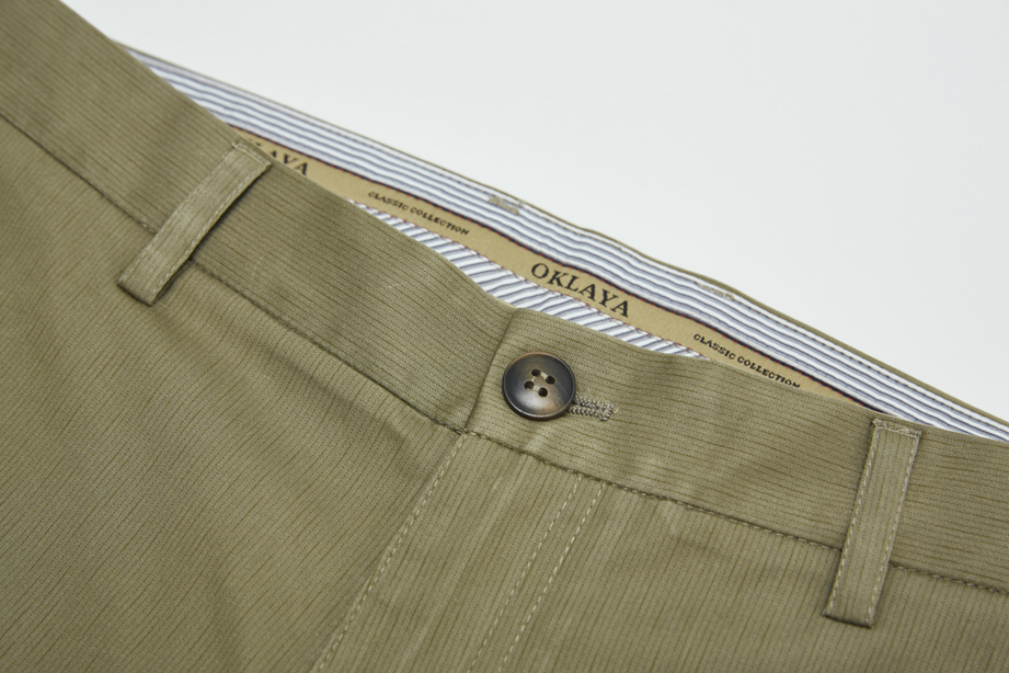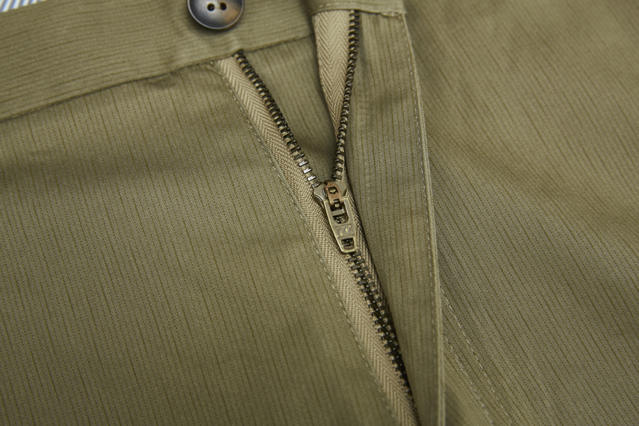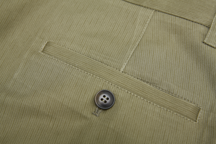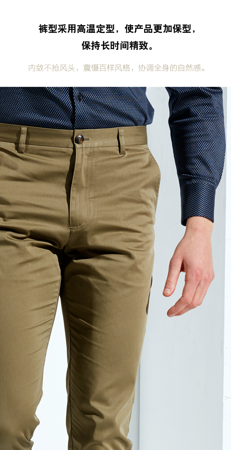 经典腰头设计,平整有型;圆润富有光泽的树脂纽扣,精致美观,十字走线防脱落。
