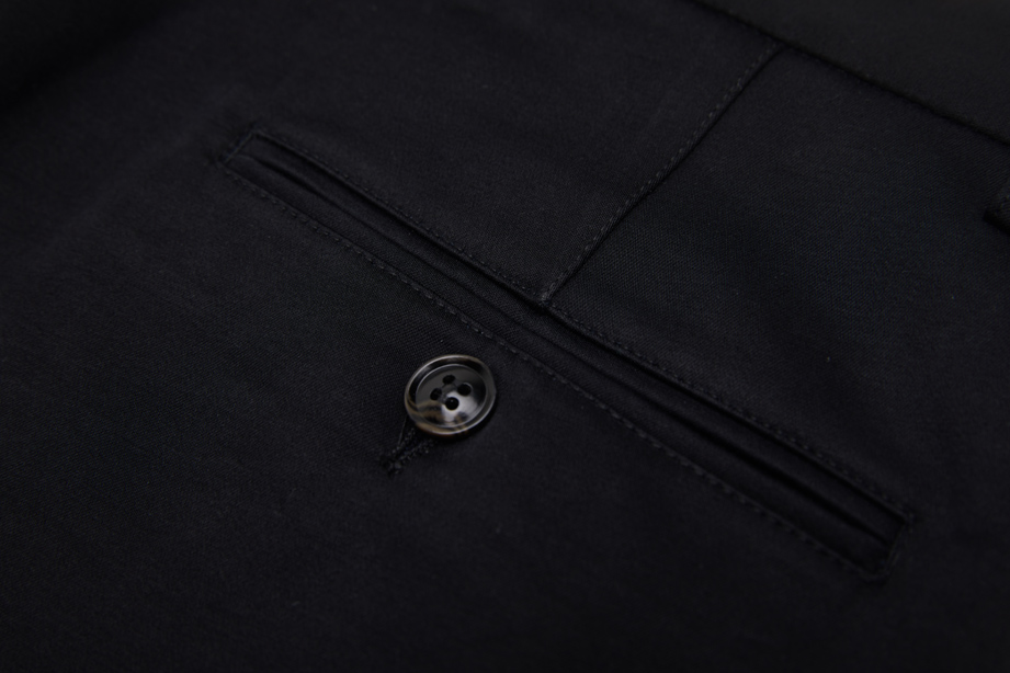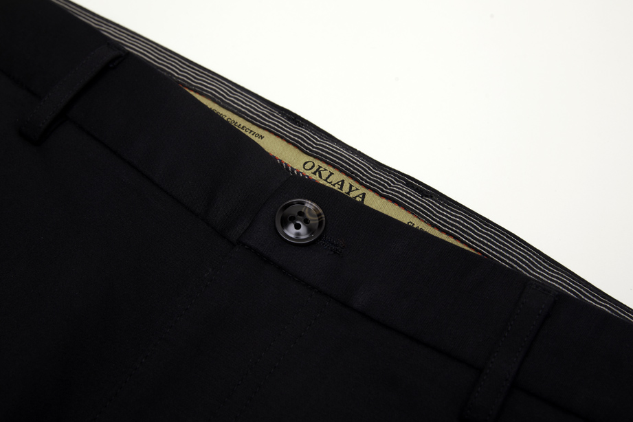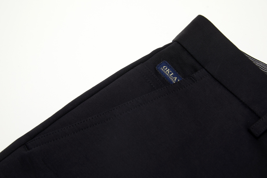 经典腰头设计,平整有型;圆润富有光泽的树脂纽扣,精致美观,十字走线防脱落。