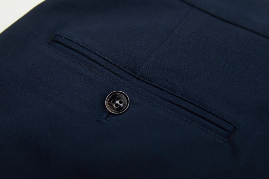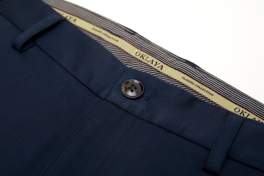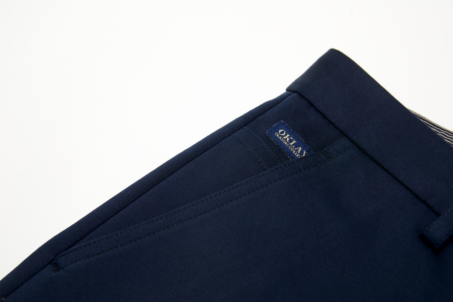 经典腰头设计,平整有型;圆润富有光泽的树脂纽扣,精致美观,十字走线防脱落。