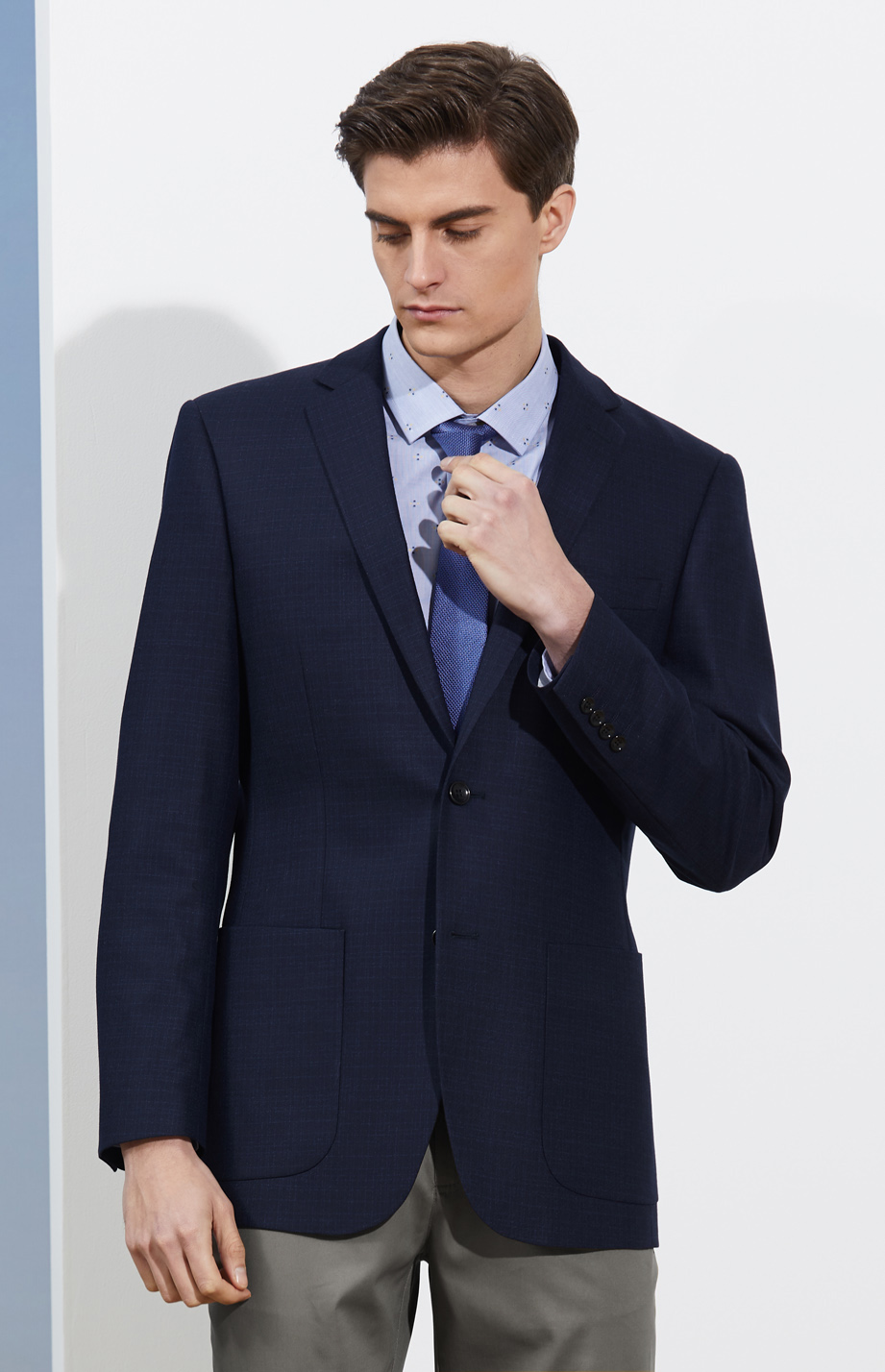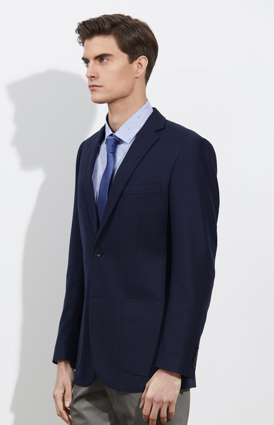 简约平驳领设计,衣襟自然贴体,前胸立体挺括。