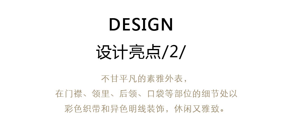 简约时尚,领内拼接异色牙子,异色明线装饰,休闲感十足。