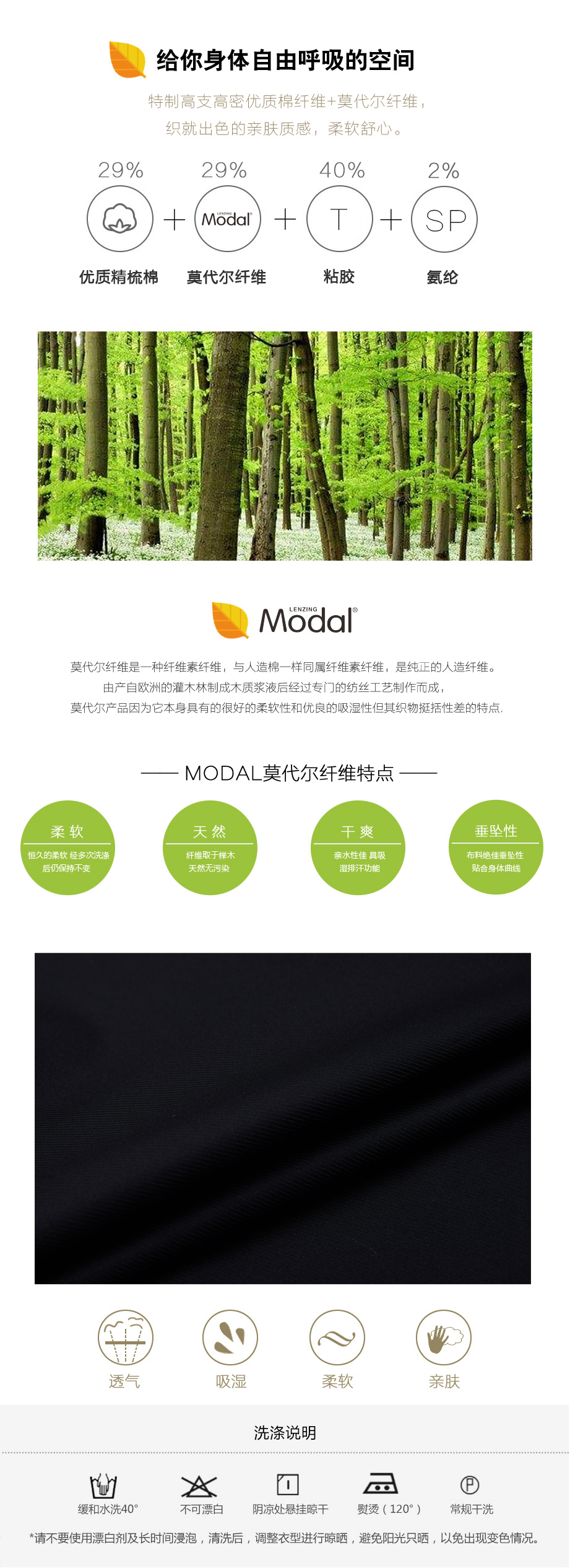 | 面料: | 29%精梳棉29%莫代尔40%粘胶2%氨纶 | |||