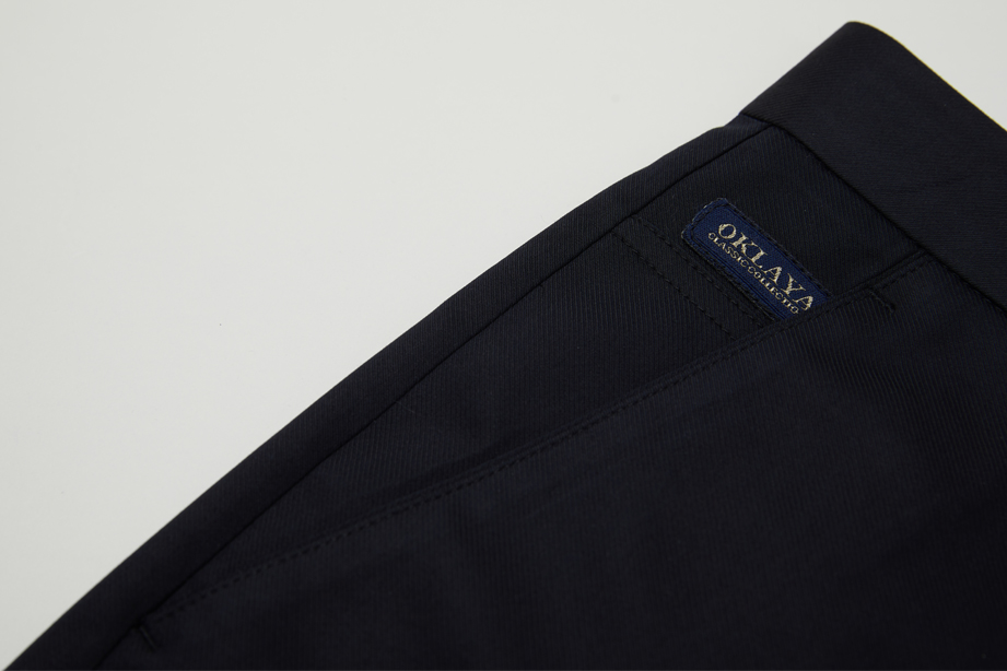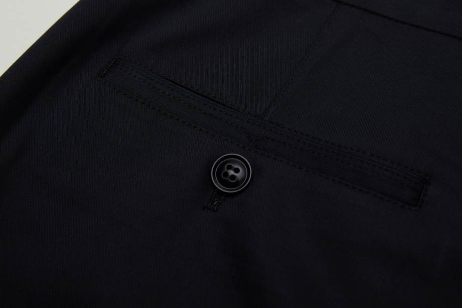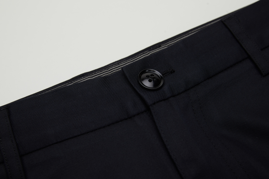 经典腰头设计,平整有型;圆润富有光泽的树脂纽扣,精致美观,十字走线防脱落。