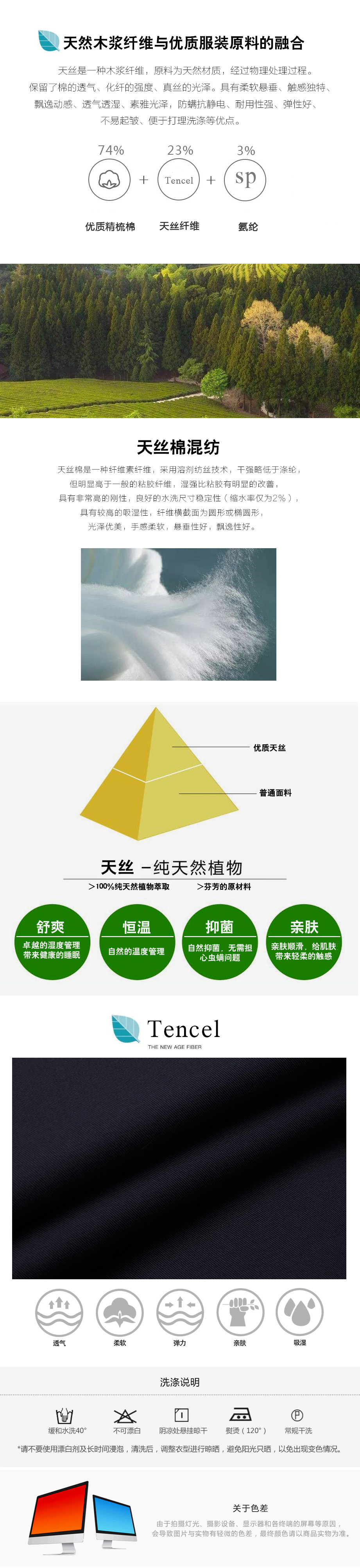 | 面料: | 74%精梳棉23%天丝3%氨纶 | |||