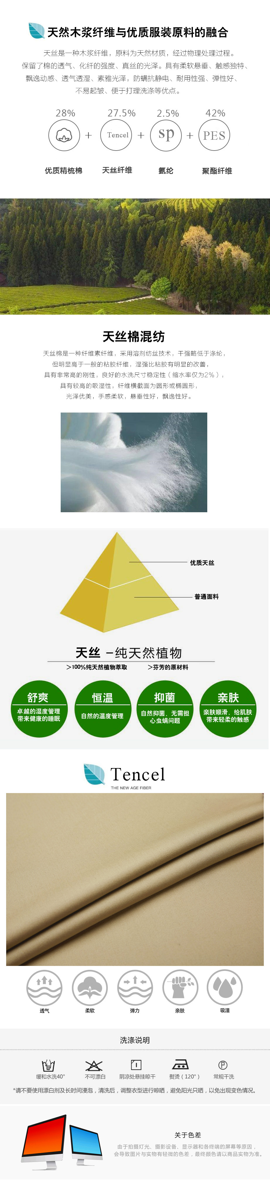 | 面料: | 28%棉27.5%天丝42%聚酯纤维2.5%氨纶 | 柔软: |