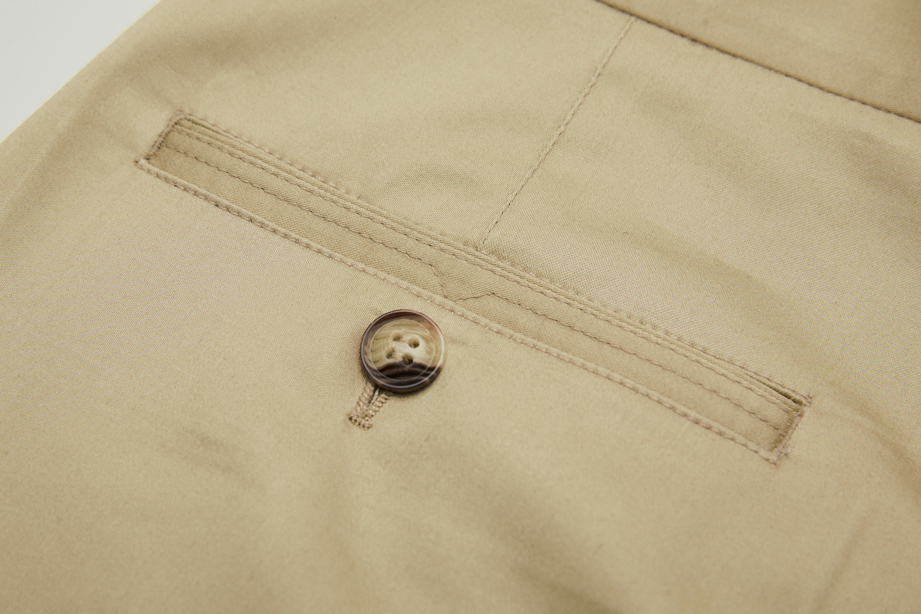 经典腰头设计,平整有型;圆润富有光泽的树脂纽扣,精致美观,十字走线防脱落。
