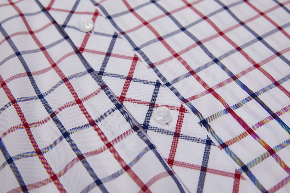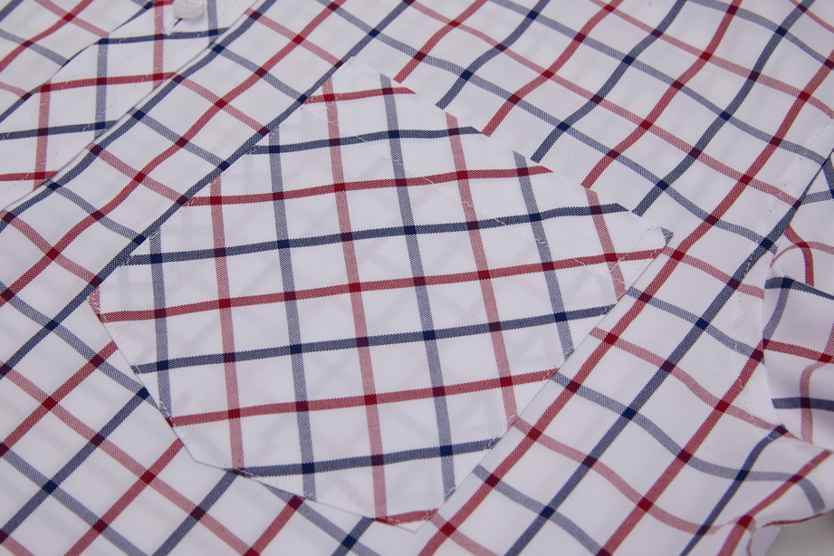 经典明贴门襟、格纹斜裁设计;专用定制纽扣,精致耐用,车线精密走针,不易脱落。
