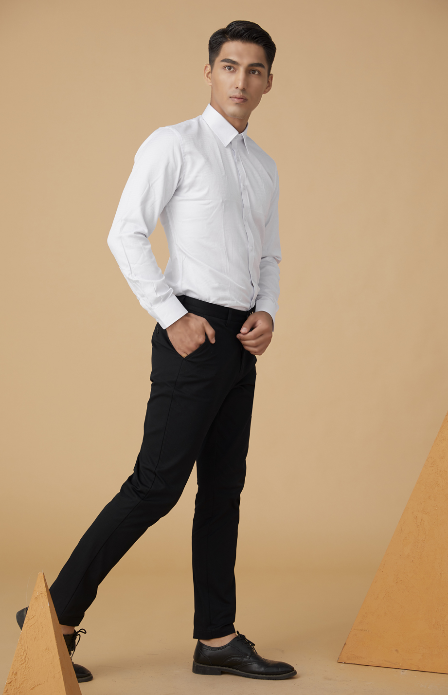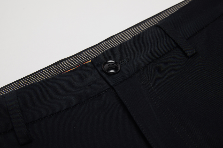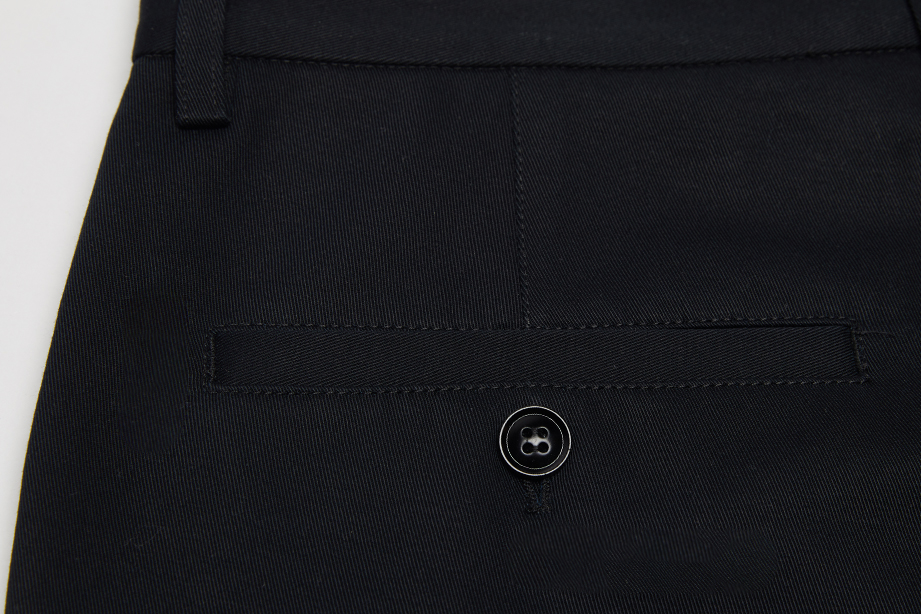 经典腰头设计,平整有型;圆润富有光泽的树脂纽扣,精致美观,十字走线防脱落。
