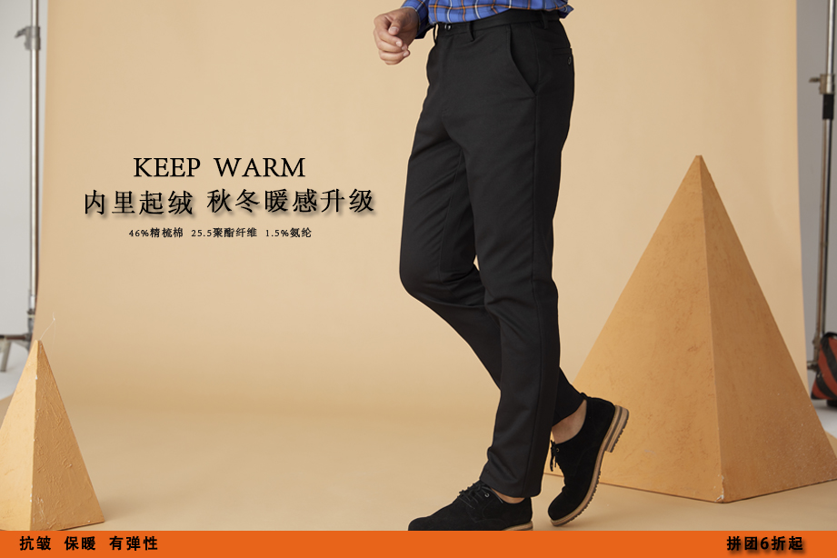 | 款名: | 黑色棉聚酯纤维混纺加厚抗皱微弹秋冬休闲裤 | |||||