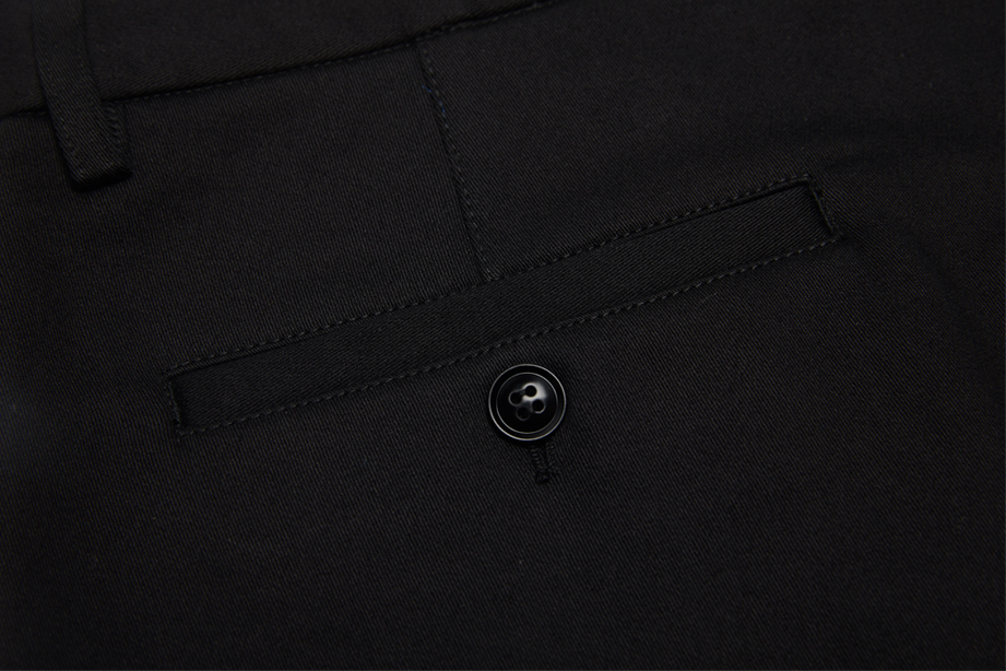 经典腰头设计,平整有型;圆润富有光泽的树脂纽扣,精致美观,十字走线防脱落。