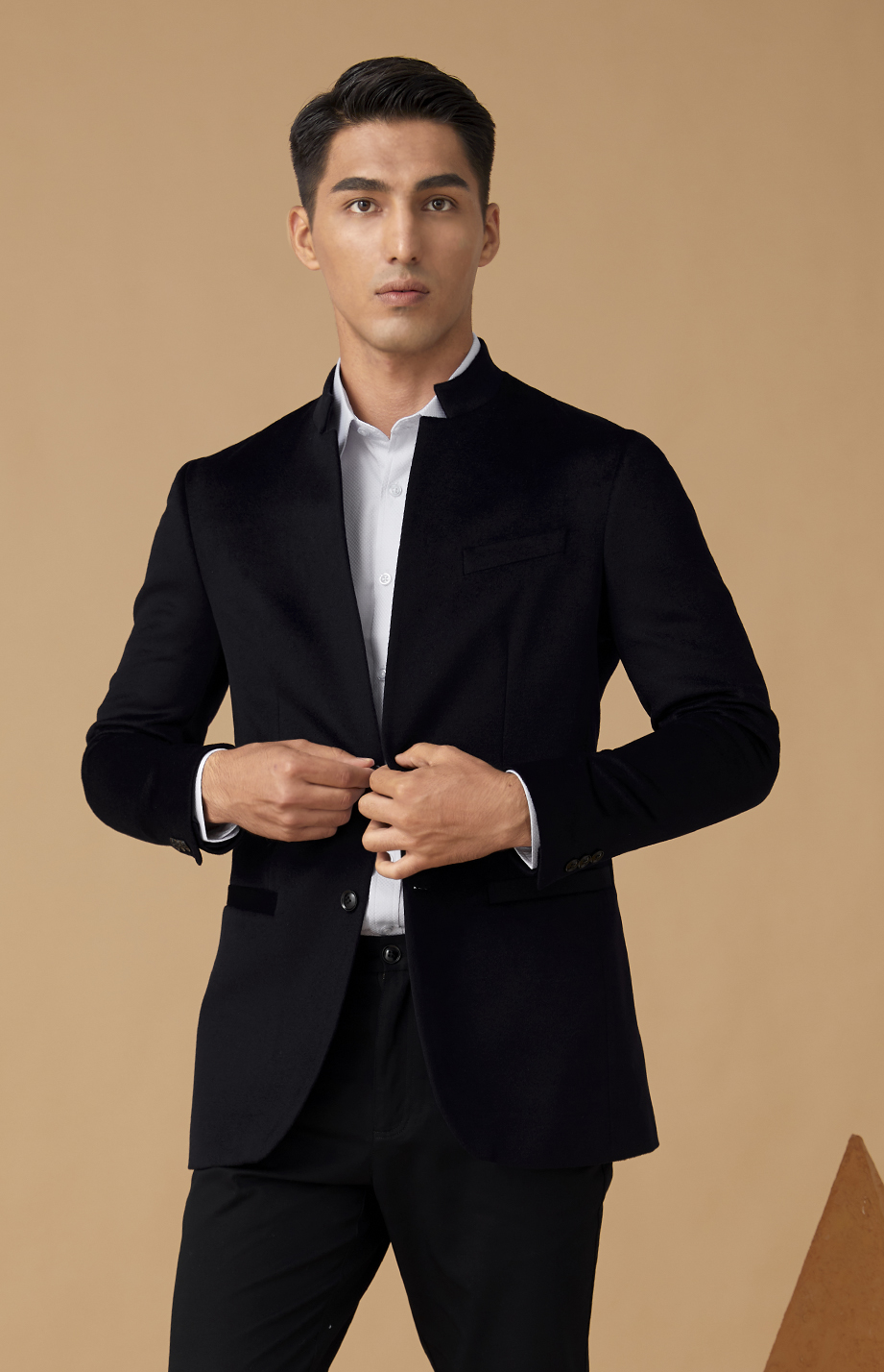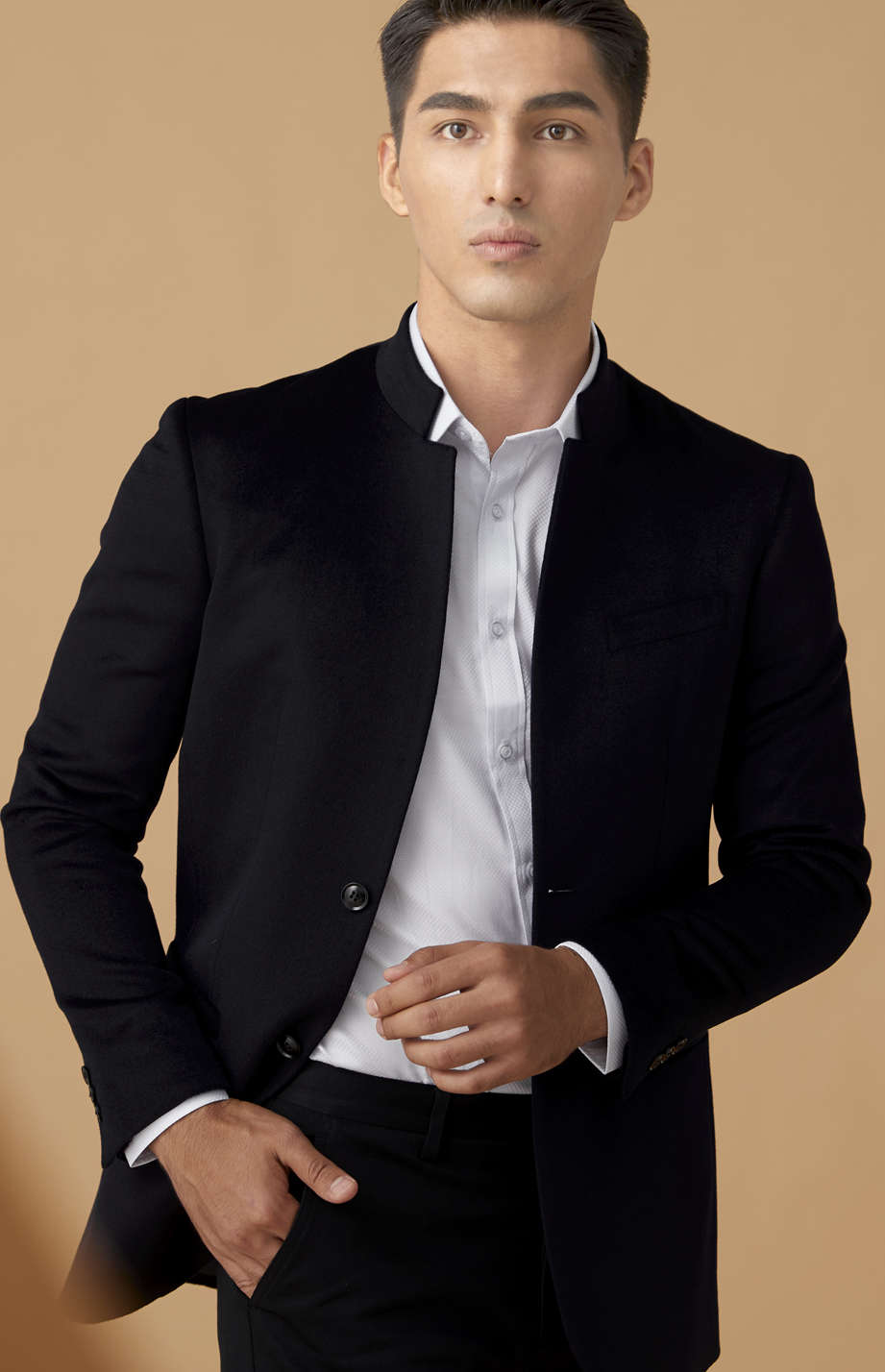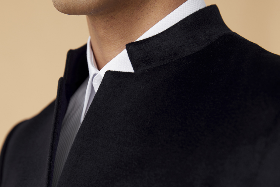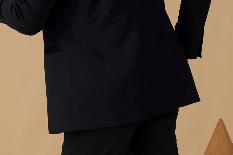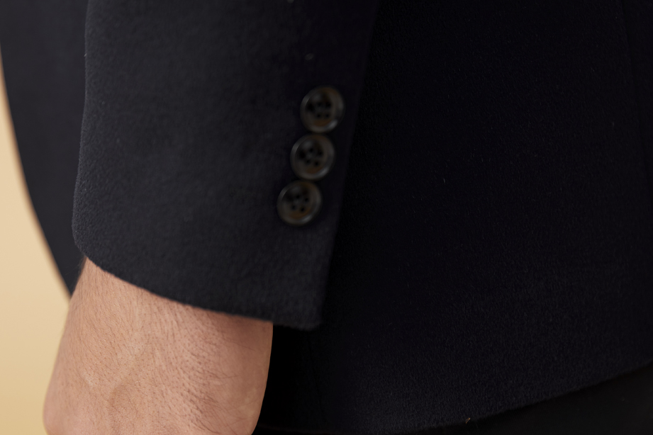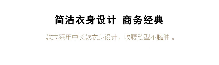 简约明门襟,单排两粒纽扣,选用高品质树脂扣,简约商务。