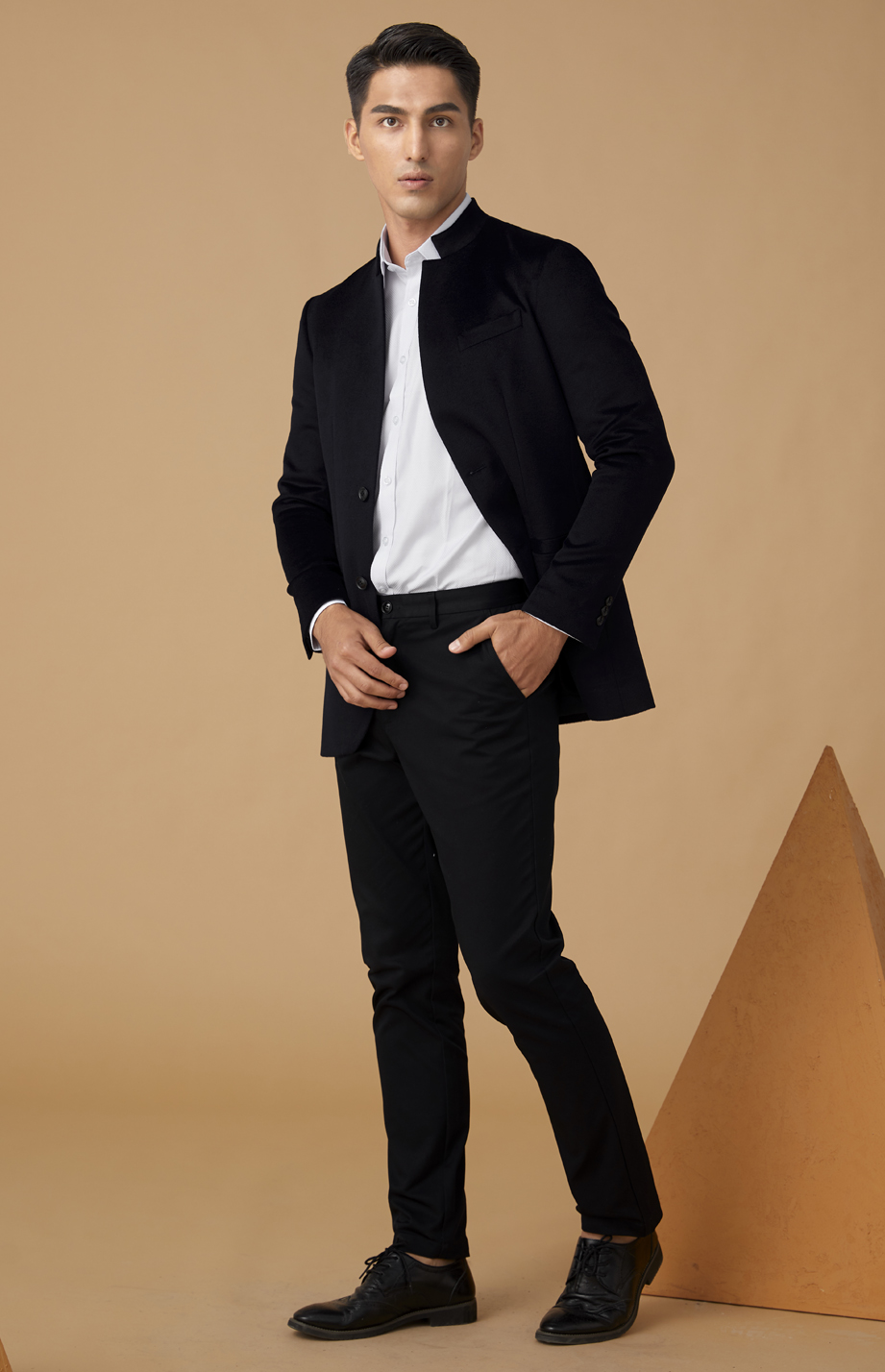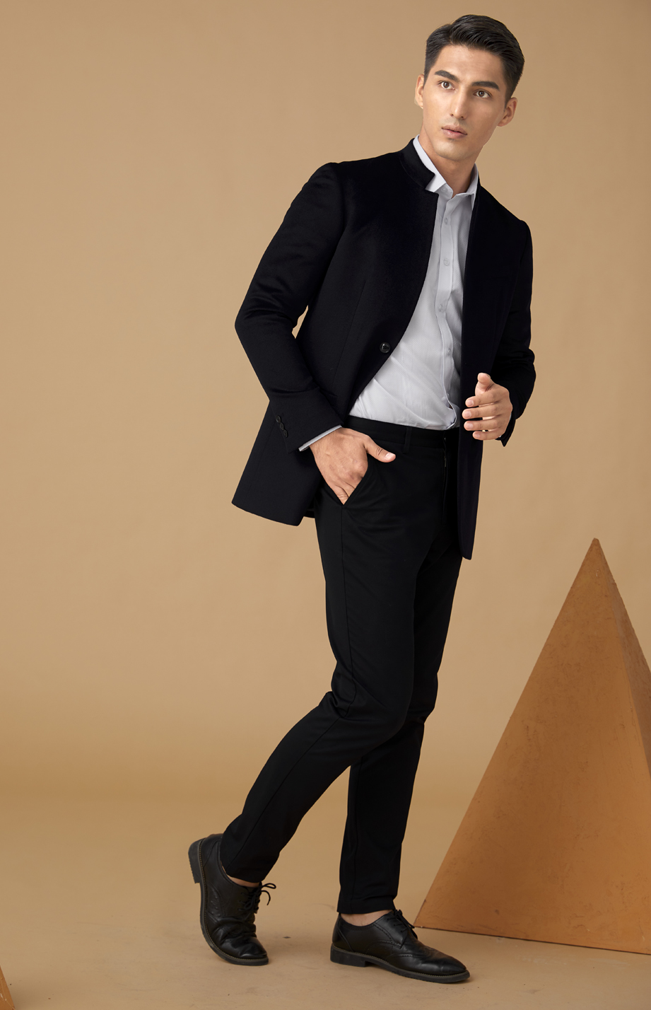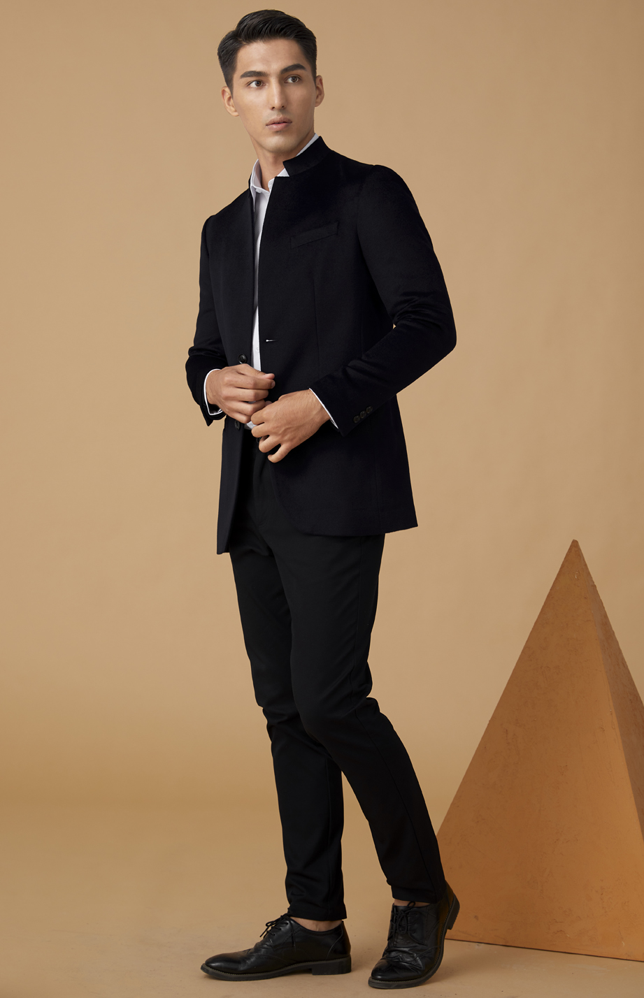 简约明门襟,单排两粒纽扣,选用高品质树脂扣,简约商务。