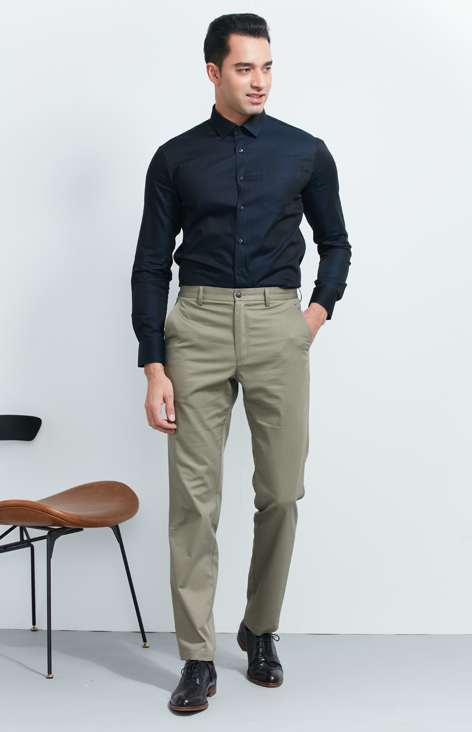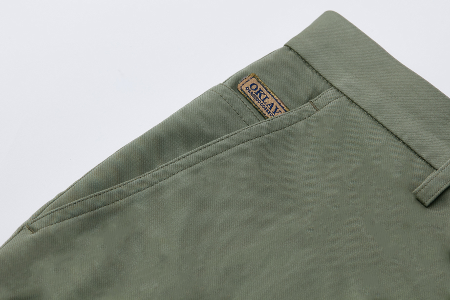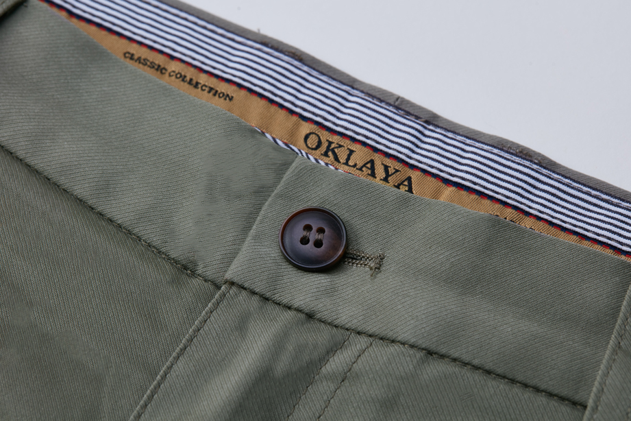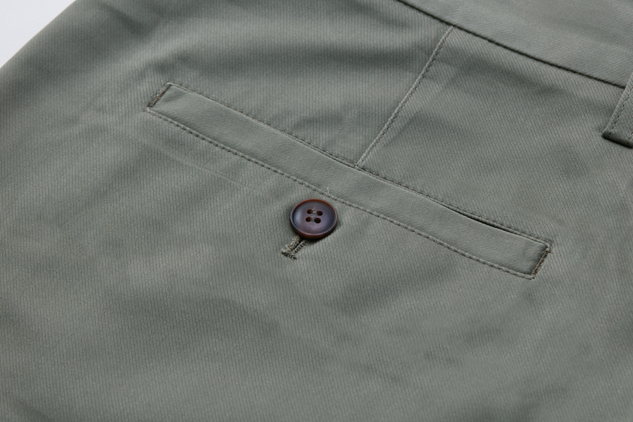 经典腰头设计,平整有型;圆润富有光泽的树脂纽扣,精致美观,十字走线防脱落。