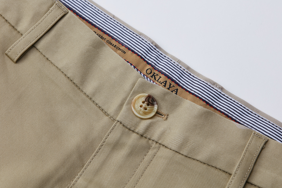 经典腰头设计,平整有型;圆润富有光泽的树脂纽扣,精致美观,十字走线防脱落。