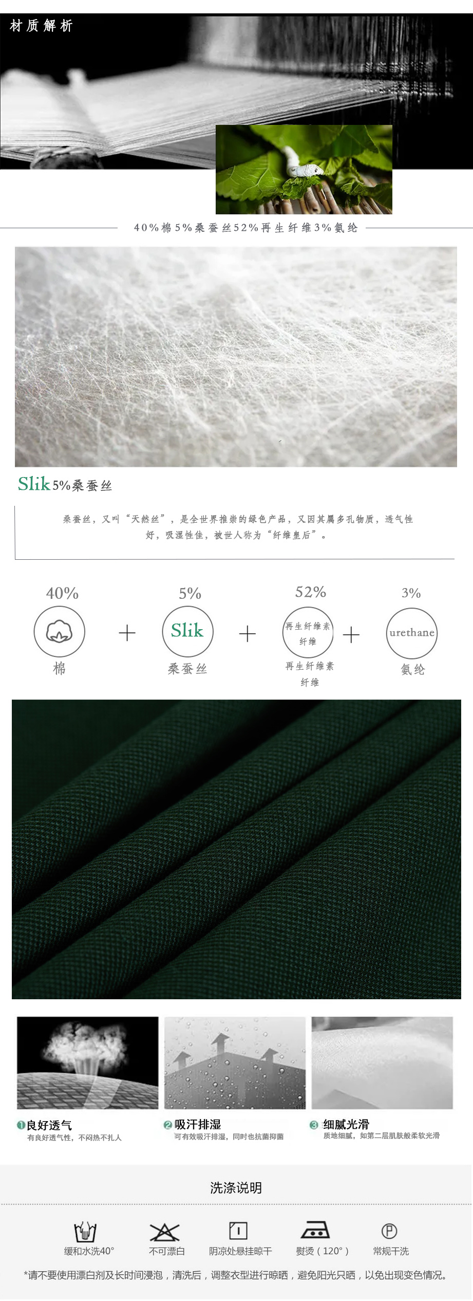 | 面料: | 5%桑蚕丝40%棉52%再生纤维素纤维3%氨纶 | |||