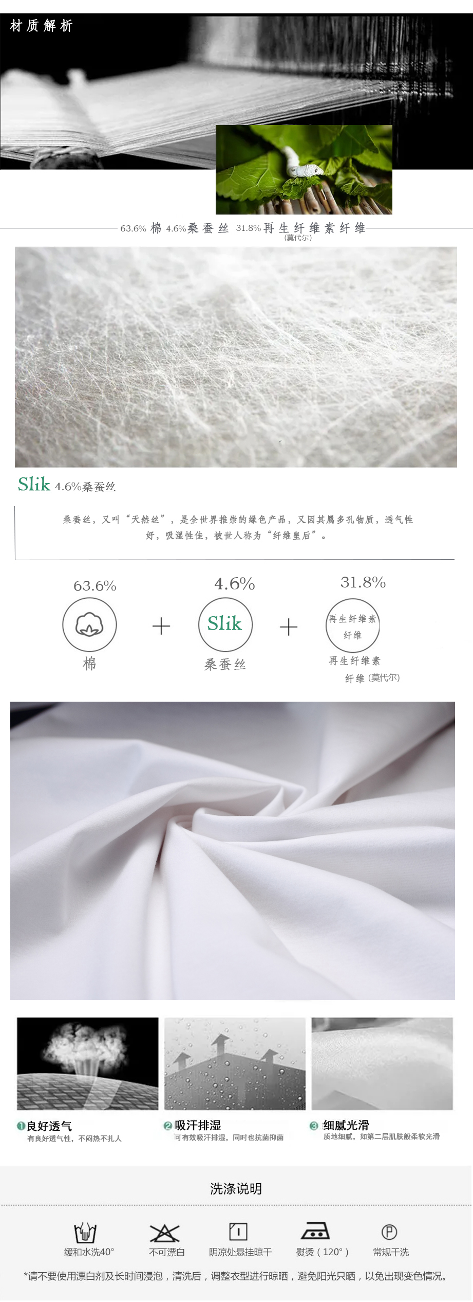 | 面料: | 4.6%桑蚕丝63.6%棉31.8%再生纤维素纤维 | |||