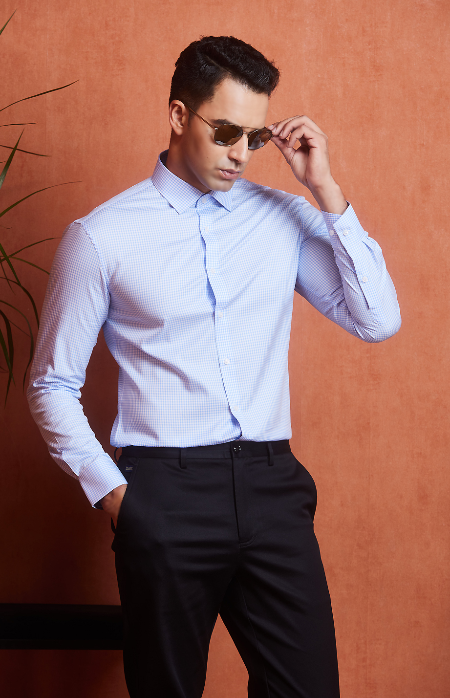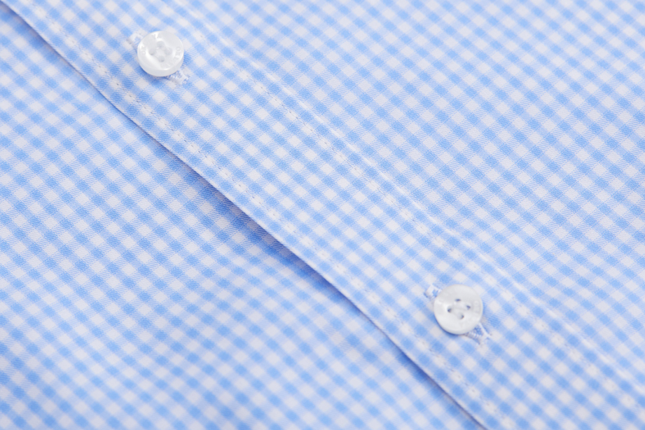 | 款名: | 蓝白格纯棉液氨整理小方领长袖衬衫 | |||