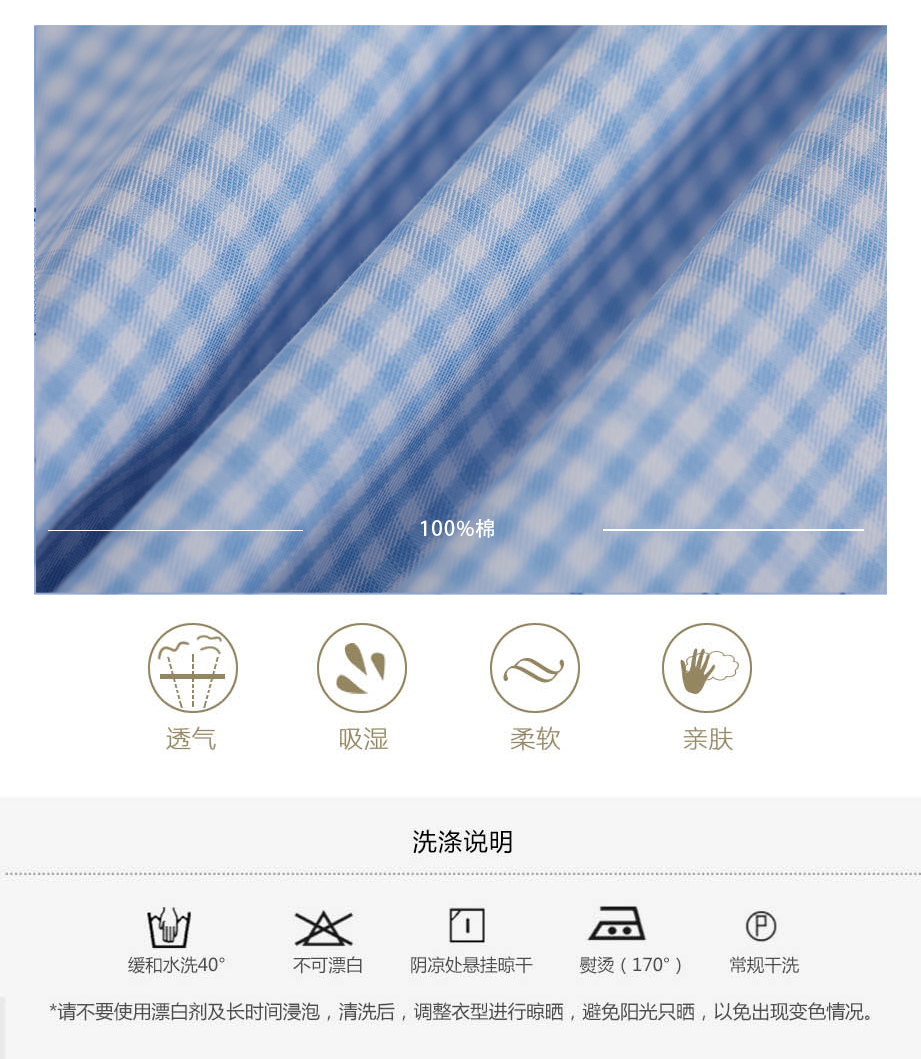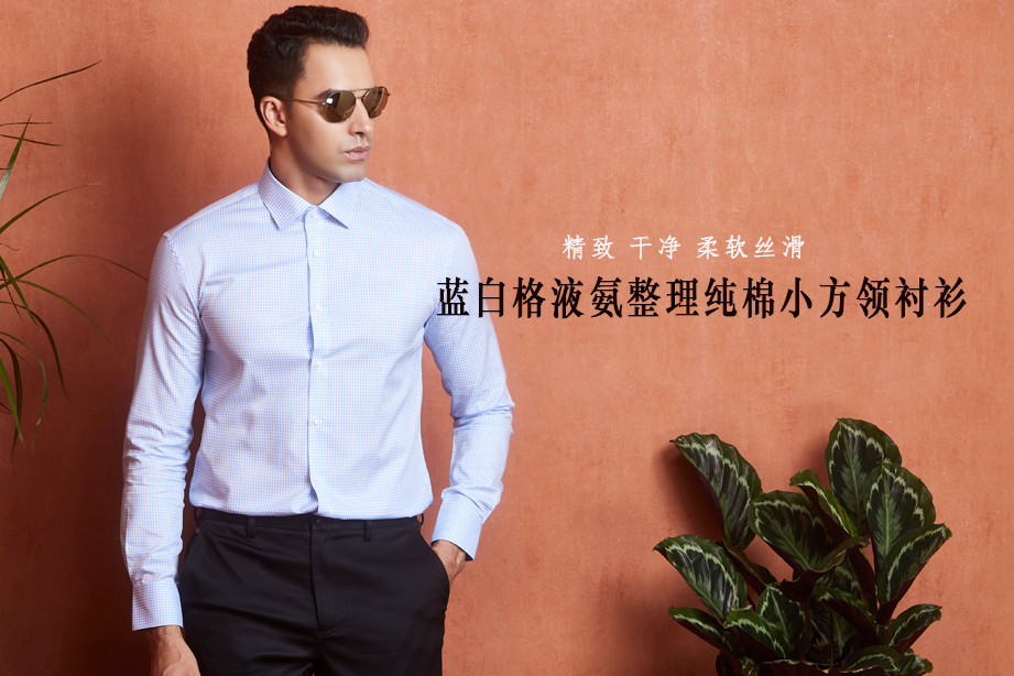 | 款名: | 蓝白格纯棉液氨整理小方领长袖衬衫 | |||||