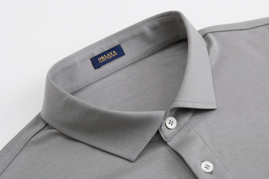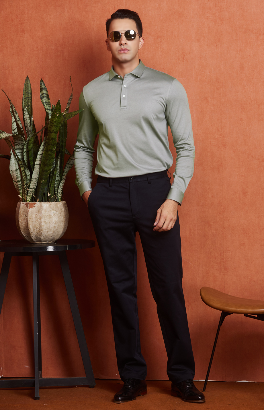 | 款名: | 浅灰绿色双面丝光长绒棉小方领长袖POLO | |||