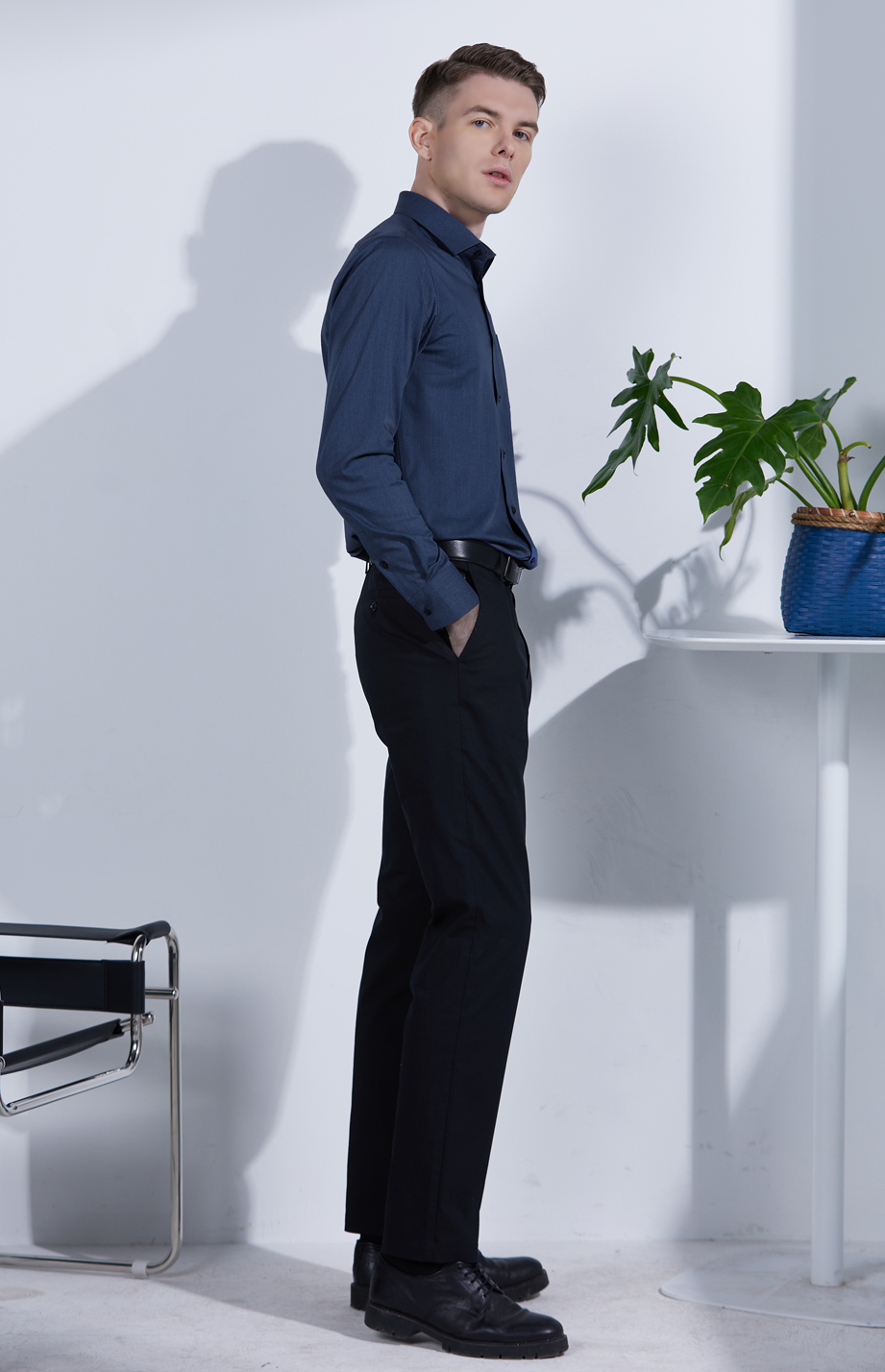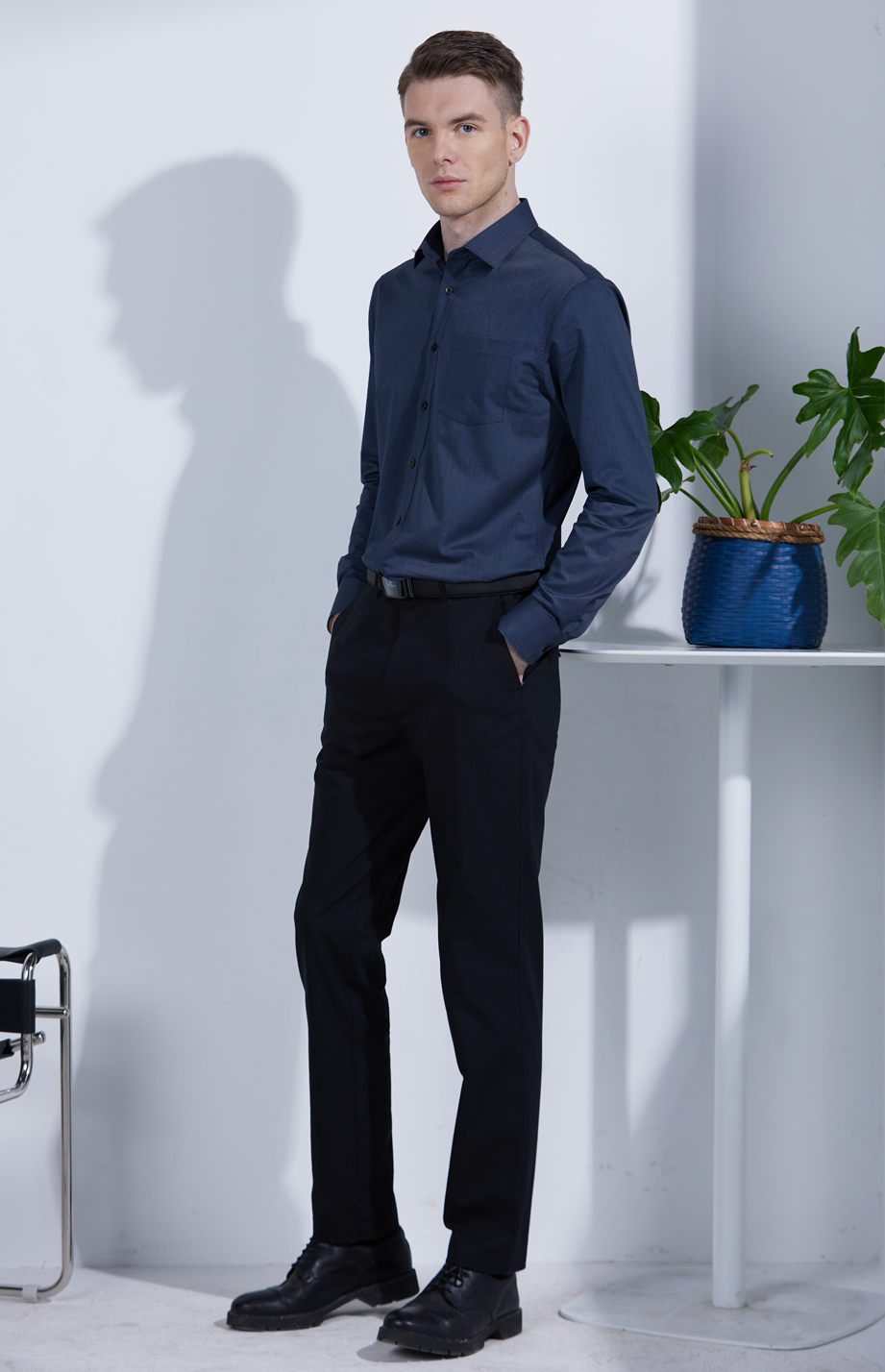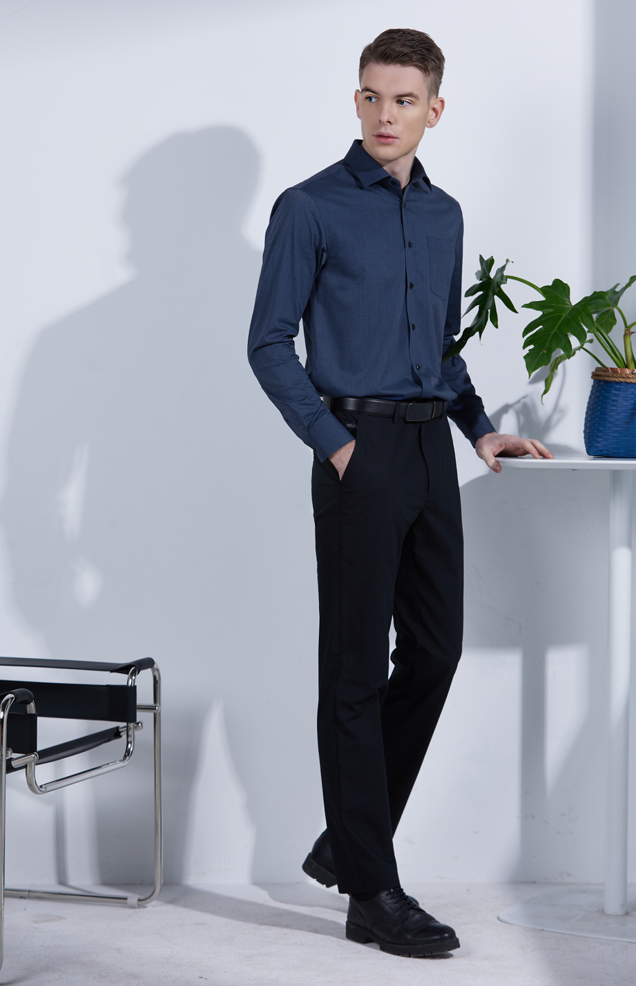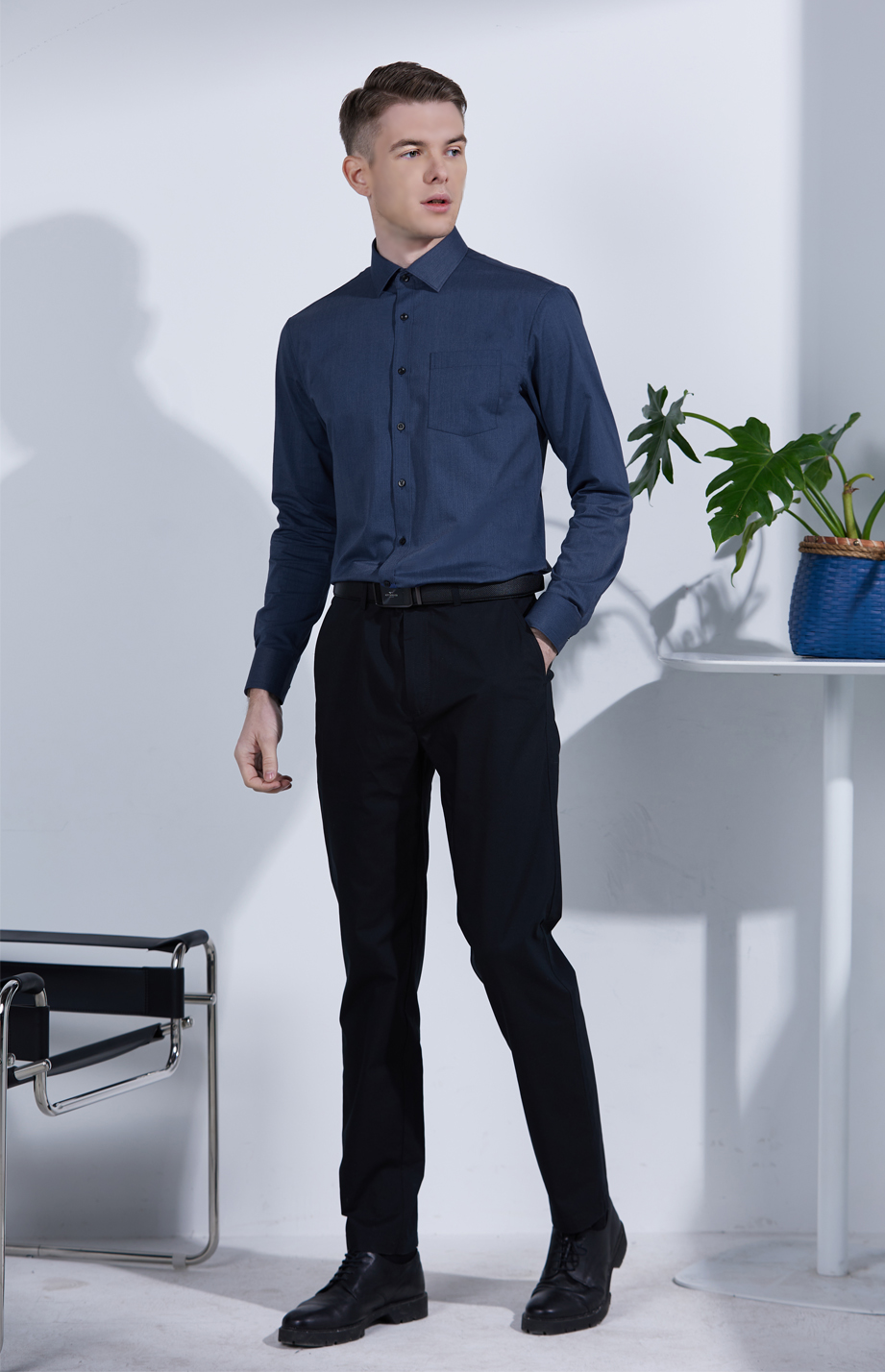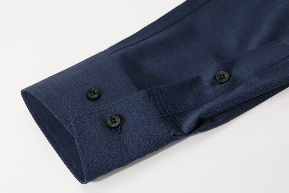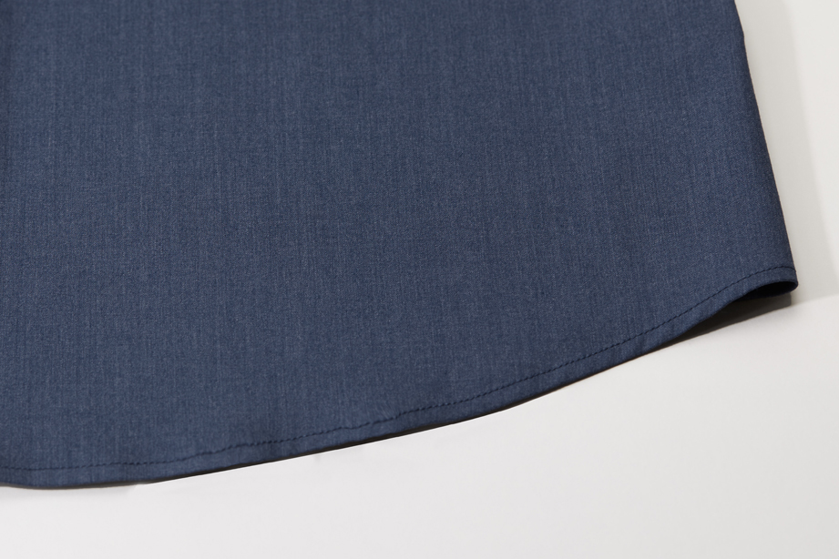 | 款名: | 深蓝仿牛仔竹纤维混纺微弹小方领长袖衬衫 | |||